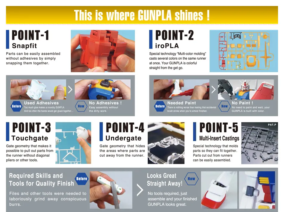 Gunpla är prisvärda modellbyggsatser i plast av väldigt hög kvalitet. De är typiskt gjutna i rätt färger och "klickas" ihop, så behöver varken målas eller limmas.