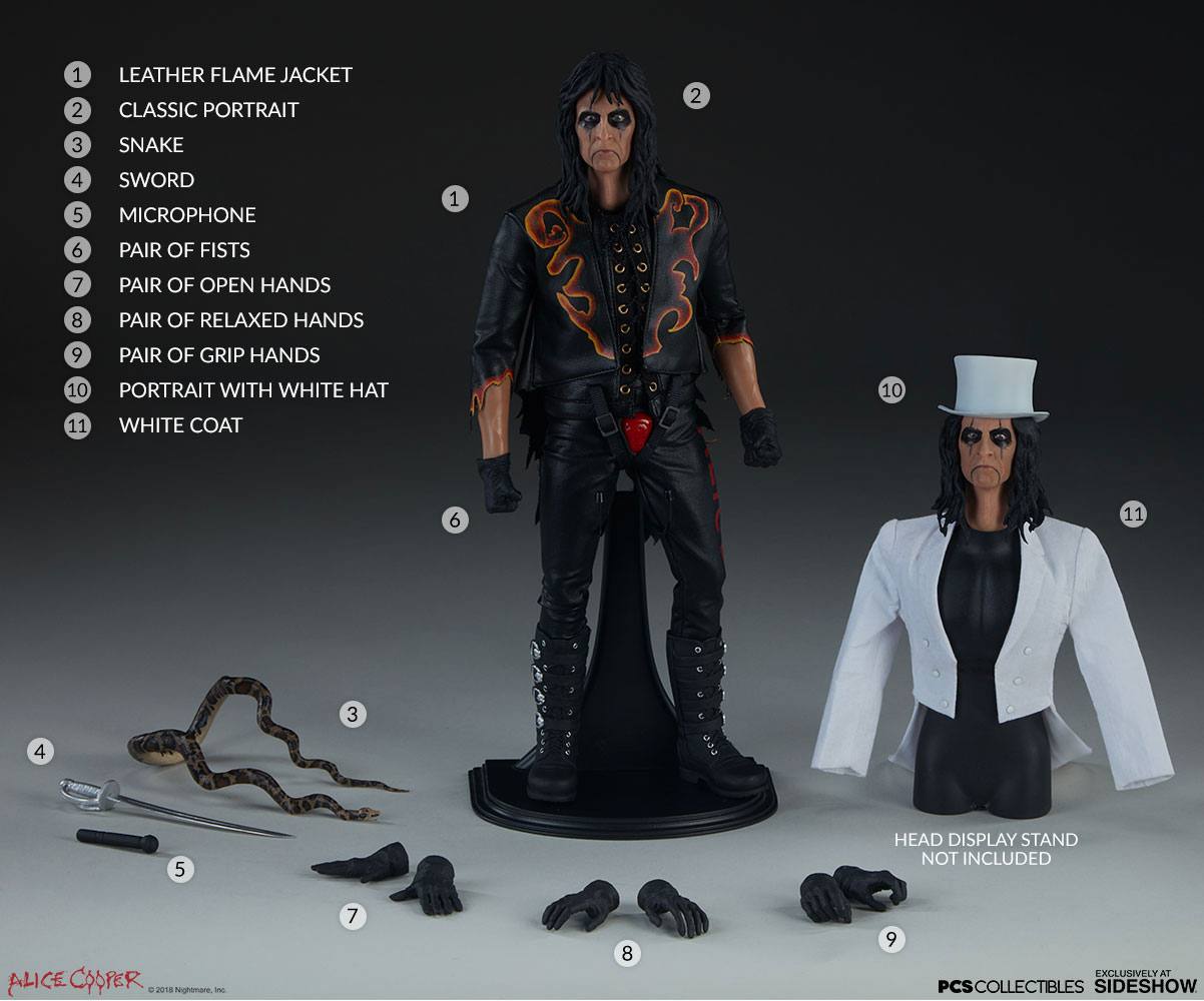 The Alice Cooper Sixth Scale Figure captures his unique stage presence as a quality collectible, featuring a high-quality articulated body with a detailed portrait with sculpted black hair and his signature face makeup, as well as an additional swap-out portrait wearing a white hat. The figure also includes four sets of interchangeable hands, including a pair of fists, open hands, relaxed hands, and grip hands.