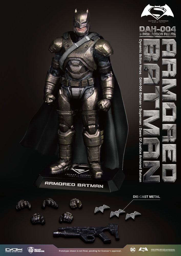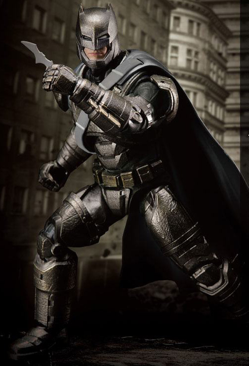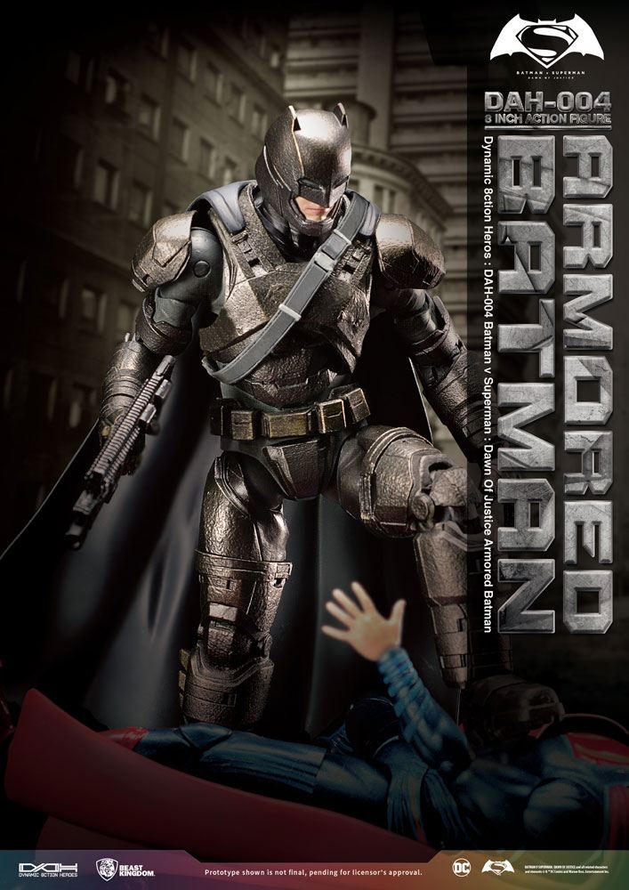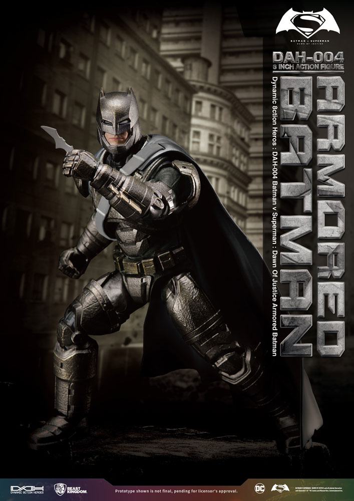 Beast Kingdom introduces the Armored Batman uses in his fight with Superman in Batman V Superman: Dawn of Justice. This proportional figure has 30 movable joints, confidently recreating heroic poses from the movie. With highly detailed, faithful design and careful professional painting, the enhanced Batman Armor is complete. Detailed aging of the suit and parts recreates the Batman who could go toe-to-toe with Superman in the movie. Comes with Batman's special weapons-the Grenade launcher and Batarangs (which is made of diecast material), allowing you to recreate Armored Batman's heroism from the movie.