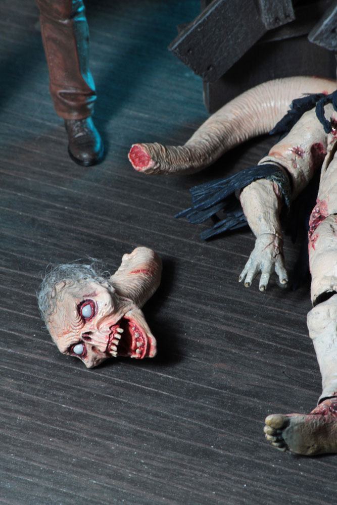 Asylum Ash comes with two interchangeable head sculpts and shotgun accessory. Henrietta comes with two interchangeable head sculpts, one of which comes apart to simulate her gruesome defeat by, you guessed it, Ash's chainsaw.