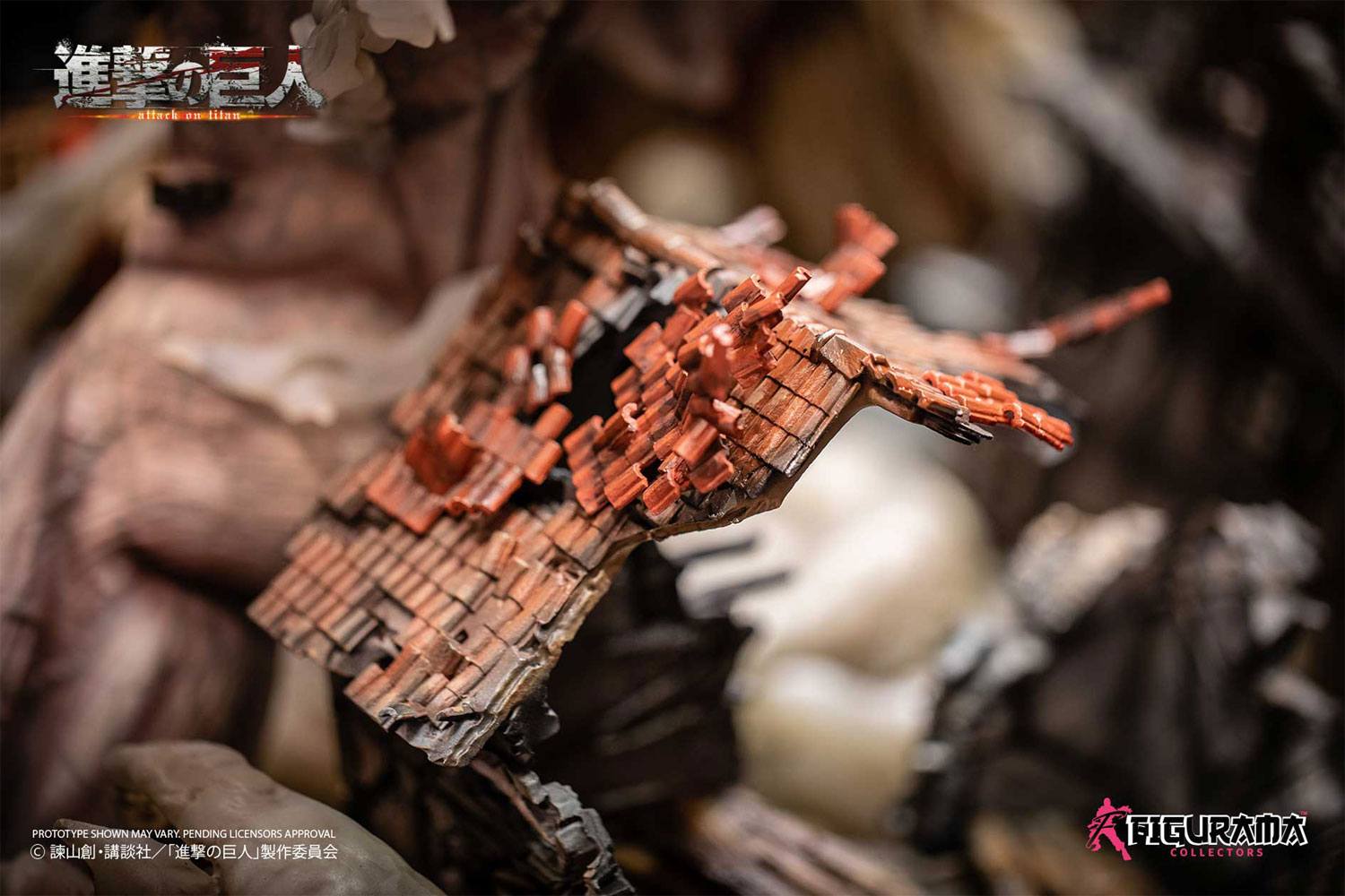 Towering an intimidating 61 cm tall, the Shifters fight across a 73 cm warzone of crumbling homes and dust storms as translucent steam flows from their burning bodies. Dynamically posed like professional hand-to-hand fighters, the Titans prepare for another explosive impact with their powerful muscles on full display. Flying in on her ODMG, Eren's childhood friend Mikasa tethers herself to the Armored Titan's neck with her flesh-cleaving blades ready, her small form revealing the massive scale of the Titans. A defined silhouette and balanced composition allow collectors to view the unforgettable battle from any angle as it unfolds over a base representing Attack on Titan's walled cities-a grim reminder of humanity's helplessness against the Titans.