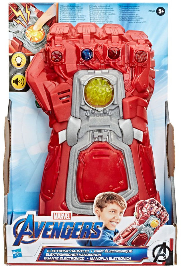 When Thanos wants to take over total control of the galaxy, he sets out on a mission to find the Infinity Stones and store them in his impressive, golden Infinity Gauntlet. Kids can imagine summoning the power of the Infinity Stones and controlling the fate of the galaxy with the Light-Up Electronic Gauntlet. This Avengers toy includes lights and sounds for even more super hero fun! Push the center button on the fist to light up the center stone and to activate mighty sound FX! The Infinity Gauntlet Electronic Fist is inspired by the Avengers: Endgame movie and is designed to fit most kids ages 5 and up.