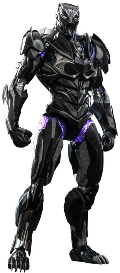 Marvel-actionfiguren, som är utformad för att fånga det omgjorda utseendet på Black Panther Mech Strike-rustningen, är 35 cm lång och har ett nytillverkat hjälmhuvud med LED-ljusfunktion; detaljerad återskapande av en tekniskt avancerad dräkt i matt svart, silver och lila som framhävs med lila lysande reflekterande effektmönster; design med LED-ljusfunktion på ögon, bröst och handflator; levereras med vapen, bland annat spjut, sköld, svärd, flera par utbytbara händer och ett figurstativ. Mech Strike pansarfiguren möjliggör även visning av "Panther Mode" genom att anta delar som LED-belyst panterhuvud, tassar och en ledad svans.
