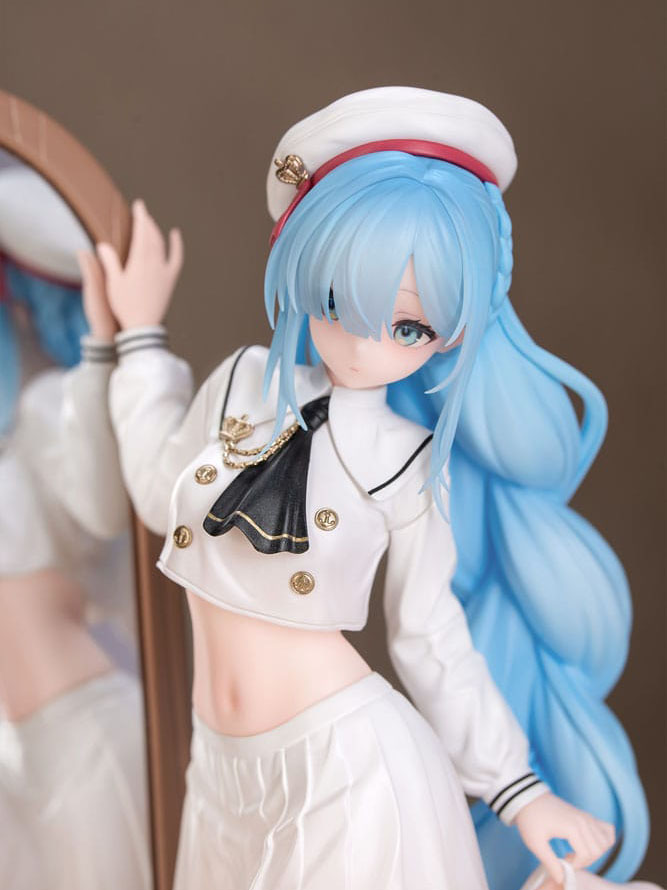 Håret är uppsatt i en flätad hästsvans och de långa blå slingorna faller över hennes vänstra axel. Hennes hår är i en gradientfärg som övergår från blått till genomskinligt. Hennes reflektion i helfigursspegeln ger figuren en touch av realism och ytterligare charm.
