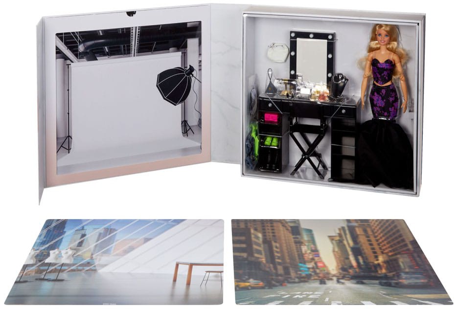 The latest installment of the @BarbieStyle fashion doll collection brings fans behind the scenes to style Barbie doll in the @BarbieStyle Studio, featuring a chair and vanity with a light-up mirror, plus drawers and shelving to display premium, on-trend accessories. Dress Barbie doll for any occasion with a fitted white top, cropped jacket and pair of jeans. Take her from day to night with a strapless gown featuring a gorgeous floral print and mermaid silhouette, and finish any look with included jewelry, three pairs of shoes, a clutch, four handbags and two pairs of sunglasses. Barbie doll features a fully posable Made to Move body, and packaging includes four backdrop inserts that allow fans to design their own photo-worthy moments. Doll cannot stand alone.