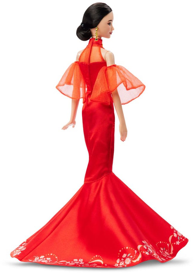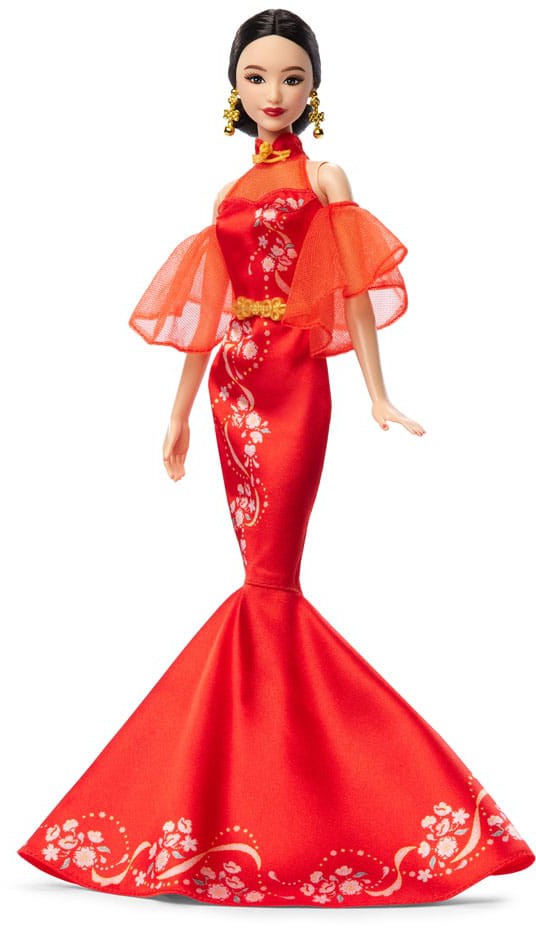 Ring in the Lunar New Year with Barbie doll! Resplendent in lucky red, she wears a quintessential qipao designed with a modern mermaid gown silhouette, a traditional mandarin collar, and sheer bell sleeves fluttering as she claps to a festive lion dance. Meihua plum blossoms adorn the dress, symbolizing strength and resilience. To complete her look, she wears golden earrings and a belt with lucky Chinese knot designs. May your Lunar New Year Barbie fill your holiday with joy, abundance, and good fortune. Doll cannot stand alone.