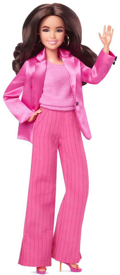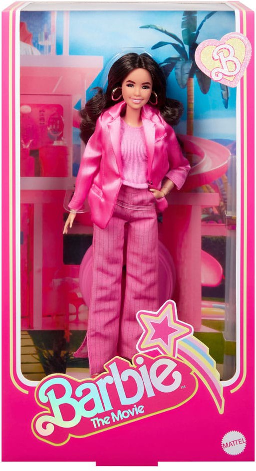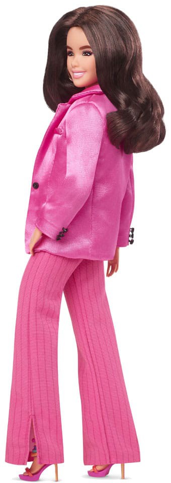 Greetings from Barbie Land! Inspired by the Gloria character in Barbie The Movie, this collectible Barbie doll commands the room in her all-pink power pantsuit, big bouncy curls, and stunning multi-color platform heels. Talk about the power of pink! Celebrating Barbie The Movie, this doll makes a great gift for fans and collectors alike! Doll stand included. Doll cannot stand alone. Colors and decorations may vary.