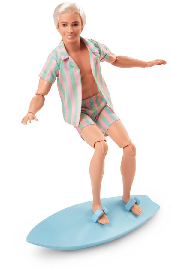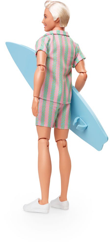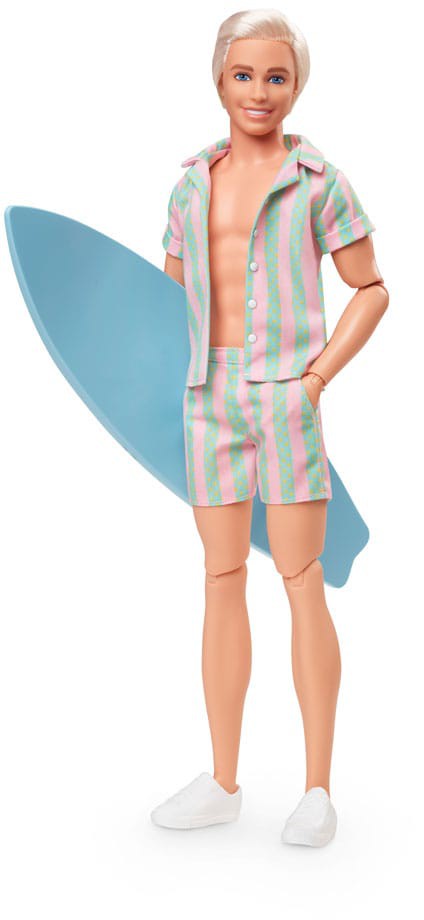 Greetings from Barbie Land! Inspired by Ken's character in Barbie™ The Movie, this Ken® doll wears a beachy, striped matching set. With a surfboard in tow, he's having the best day ever in Barbie Land! Celebrating Barbie™ The Movie, this Ken® doll makes a great gift for fans and collectors alike. Doll cannot stand alone. Colors and decorations may vary.