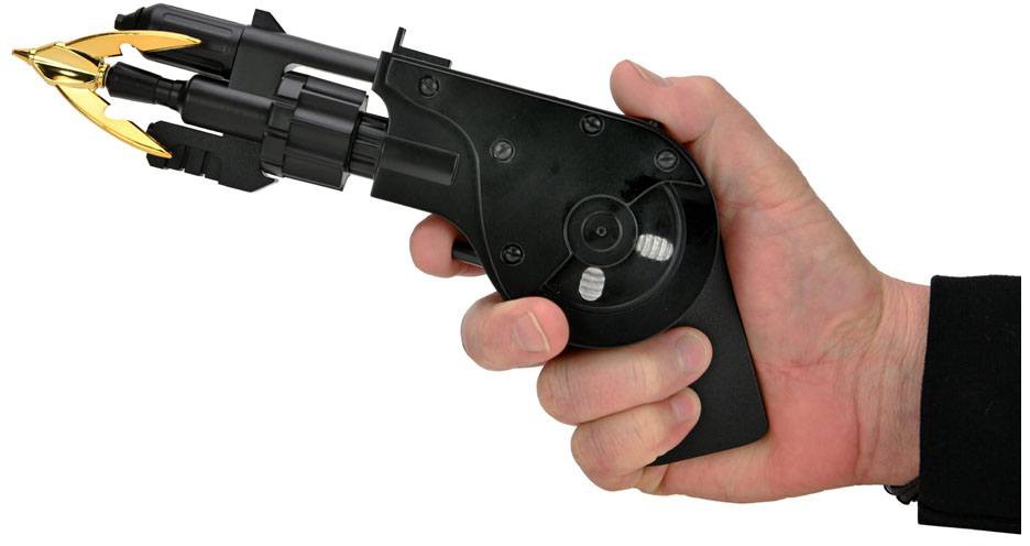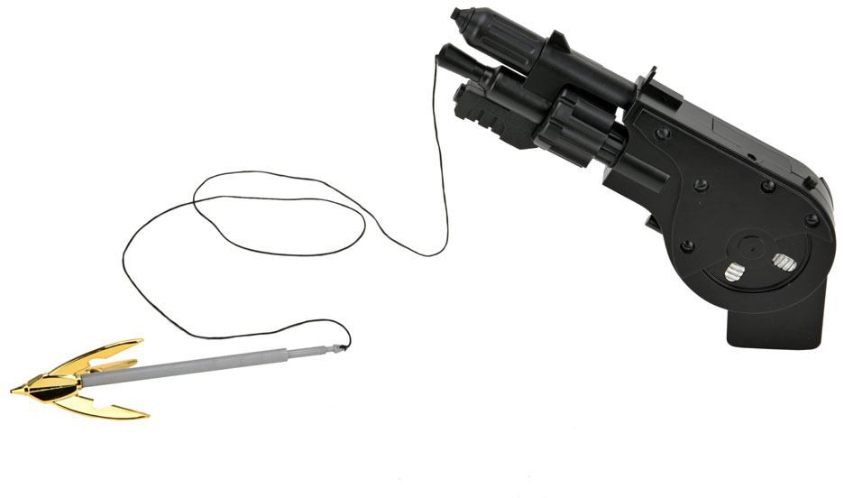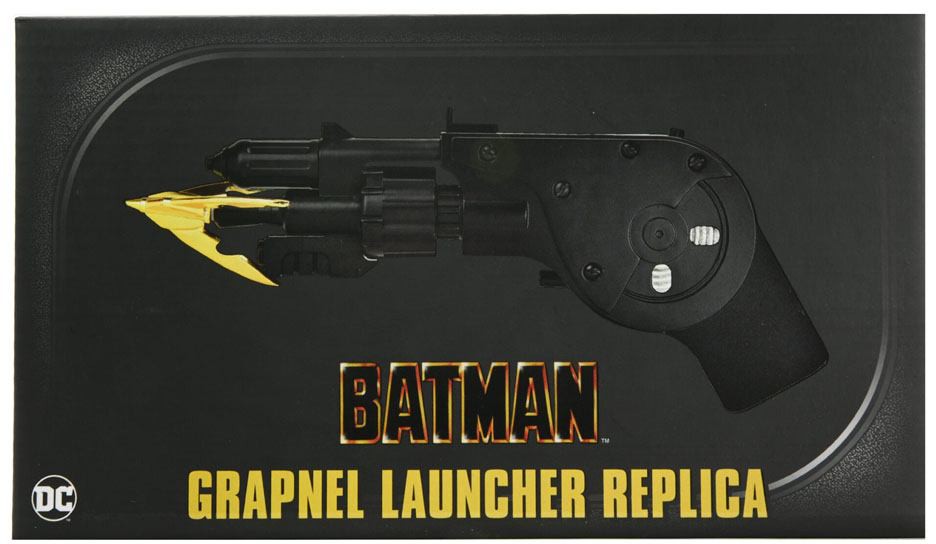 Den här replican i skala 1:1 av Batmans Grapnel Launcher har ett vikbart handtag, gripkrokfäste och en motoriserad spole som drar in repet och kroken efter avfyring.