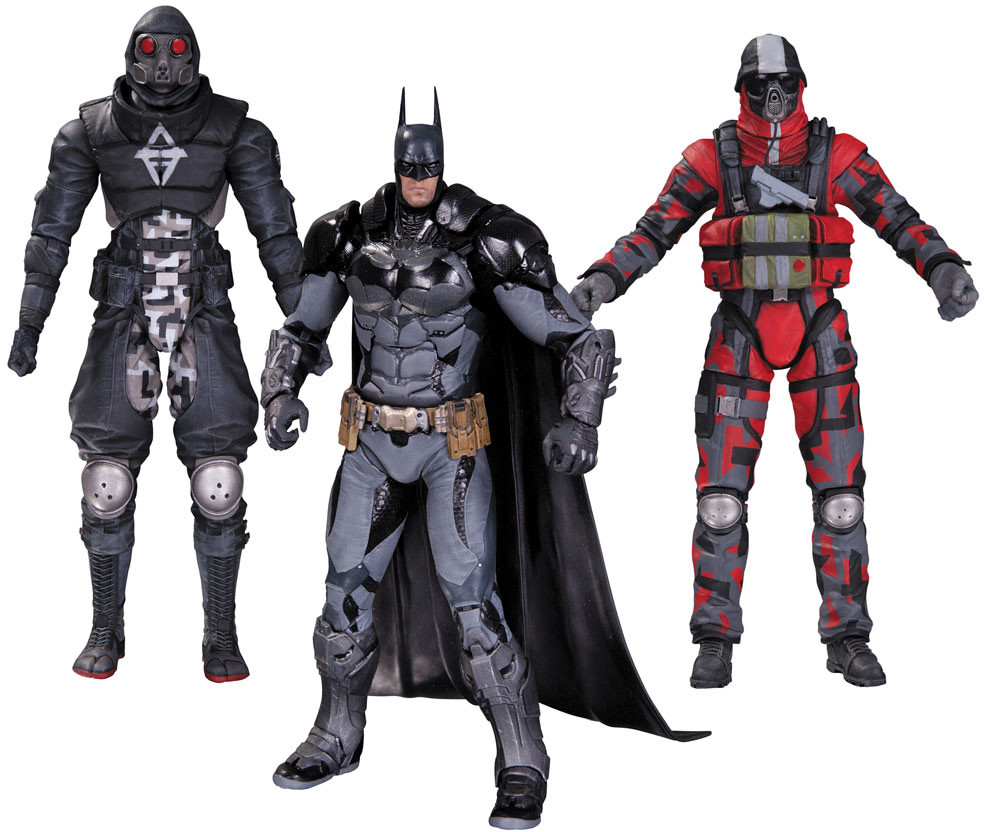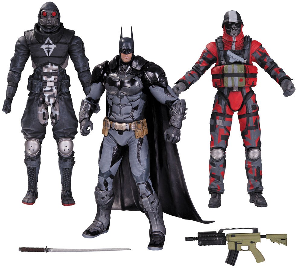 Batman takes on two well-armed thugs in this action figure 3-pack inspired by the best-selling Arkham Knight videogame! Each figure measures approximately 17 cm high. Thugs come with accessories.