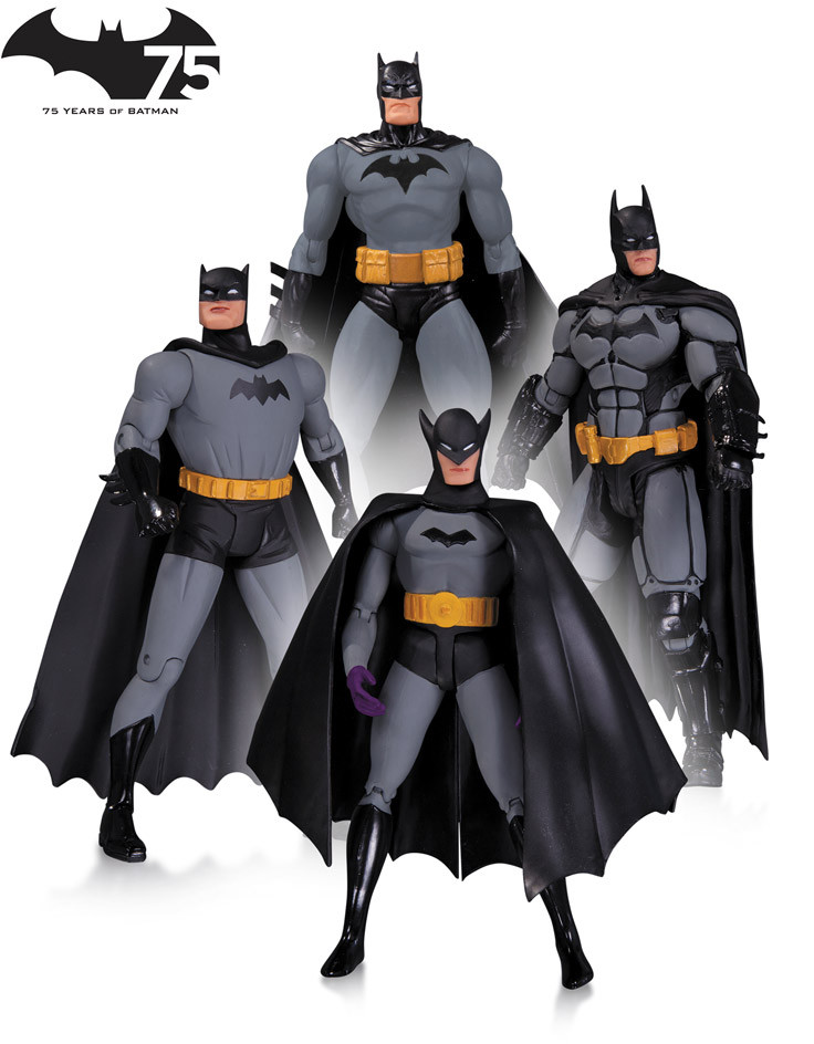 The first special edition action figure 4-pack celebrates Batman´s 75th Anniversary with figures of the Dark Knight based on the designs of Bob Kane (First Appearance), Jim Lee (Hush), Darwyn Cooke (New Frontier), and the best-selling Batman: Arkham Origins video game!