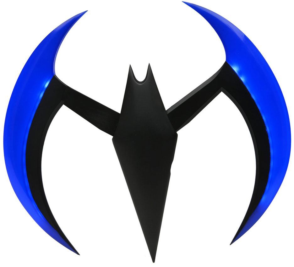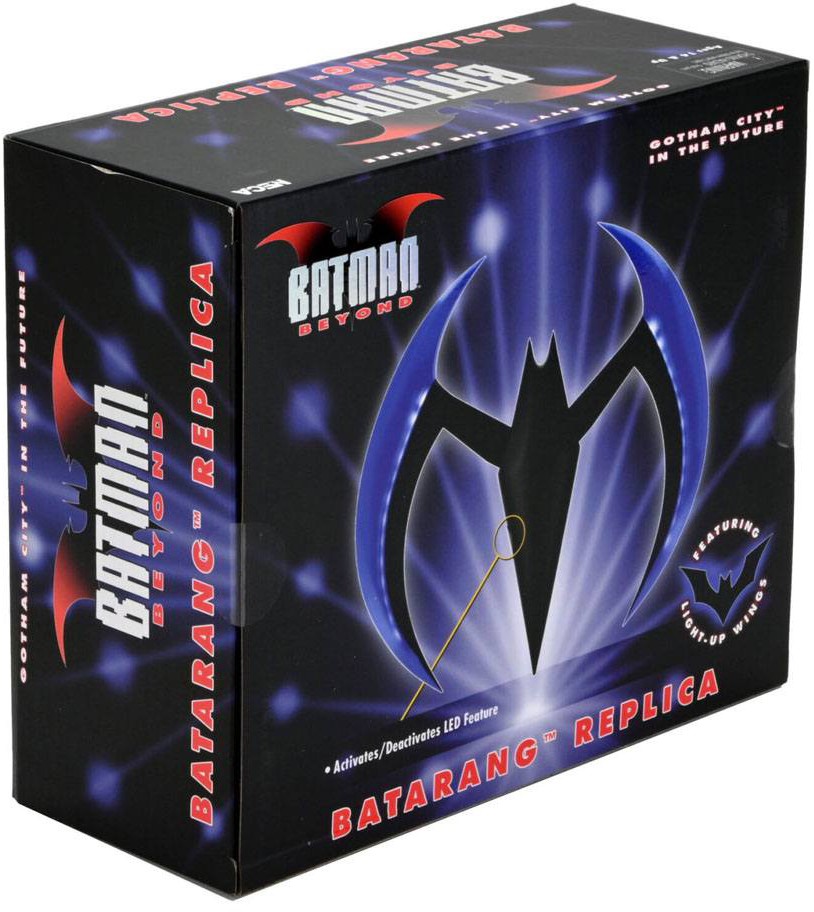 This full-size prop replica of the Batarang comes from the Batman Beyond animated series! The Batarang features blue LED lighting in the wings which can be turned on or off. Measures over 8 inches. Uses 3 button cell batteries. Test batteries included.