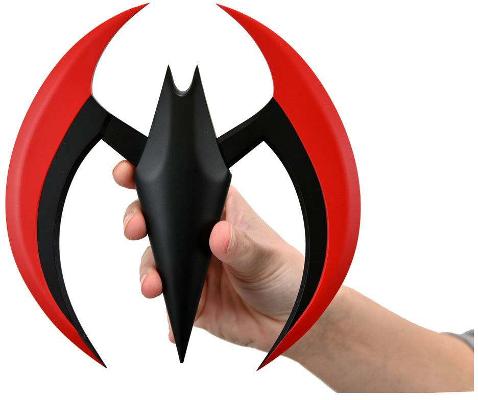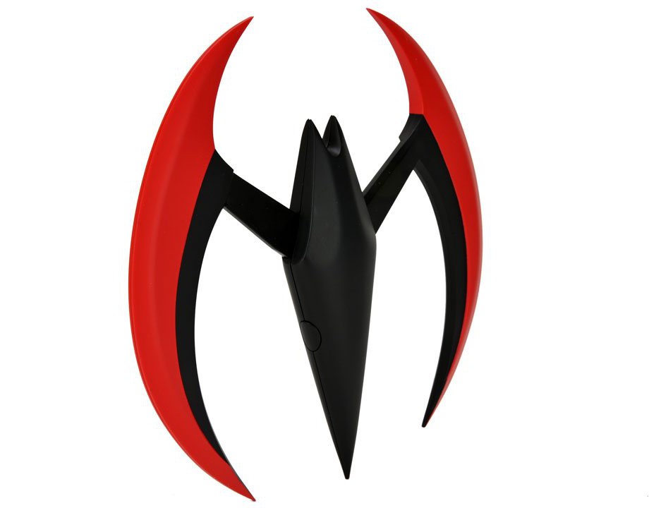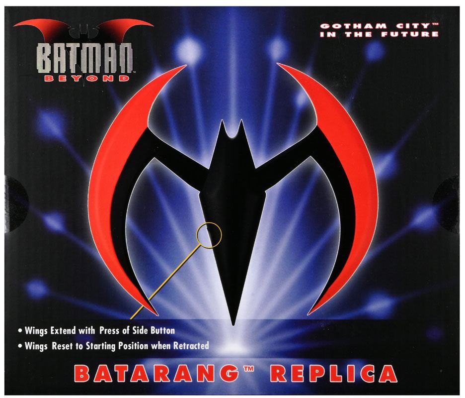 This full-size prop replica of the Batarang comes from the Batman Beyond animated series! The Batarang features spring-loaded wings which can extend with the push of a hidden button. Measures over 8 inches. Uses 3 button cell batteries, included.