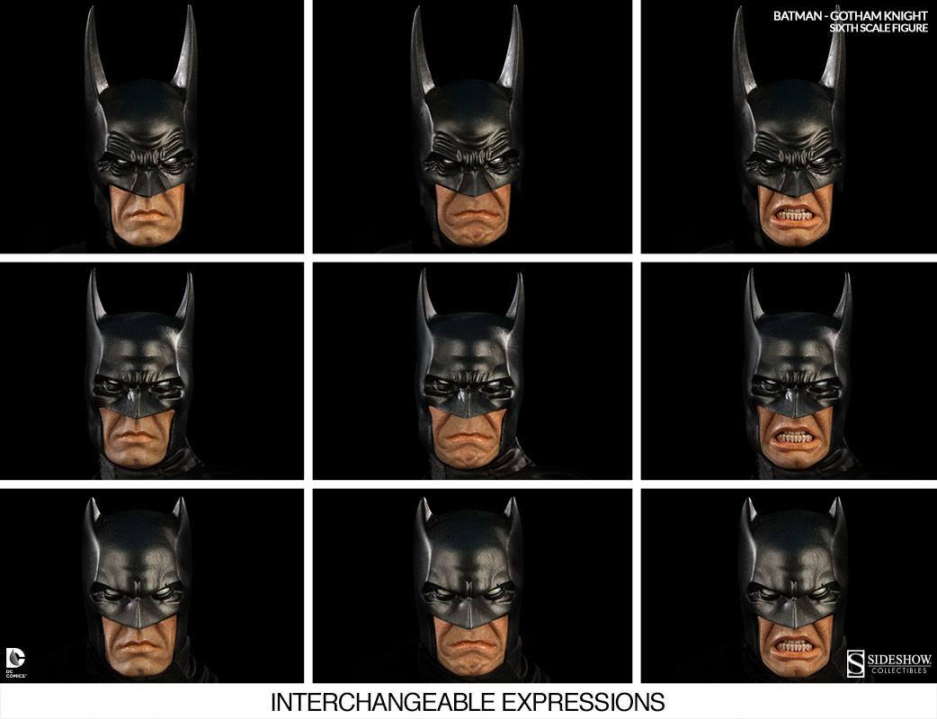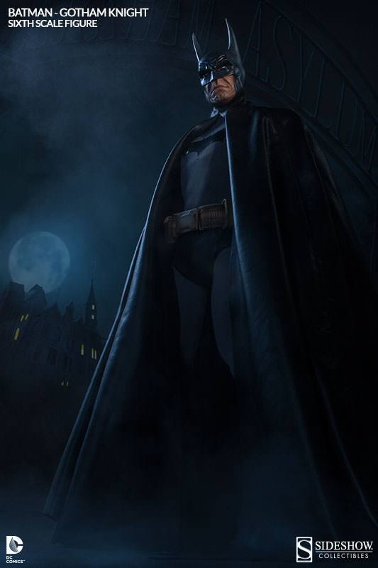 Bruce Wayne springs into action as his famed alter ego Batman! Crafted with meticulous attention to detail on a fully articulated muscular body design, our hero is disguised in a grey and black tailored Batsuit and cape. Inspired by a number of timeless comic book appearances, the Batman Gotham Knight Sixth Scale Figure invites collectors to further define their favorite look for the Caped Crusader with three cowl and mask options and three interchangeable facial expressions.
