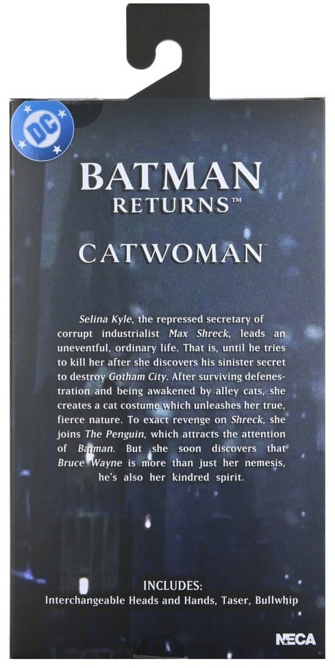 NECA presents this clothed action figure of Catwoman from Batman Returns, featuring the authorized likeness of Michelle Pfeiffer, whose unforgettable performance in the 1992 Tim Burton film still defines the character.