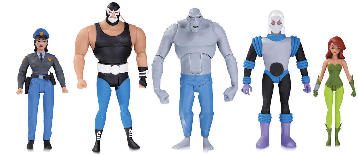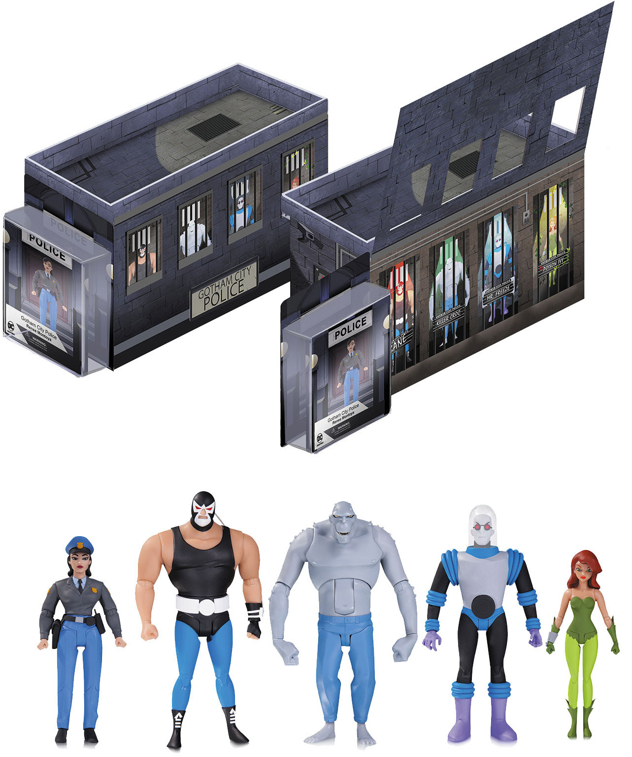 A lone cop - Renee Montoya - is surrounded by some of Gotham City's greatest evildoers - Mr. Freeze, Bane, Killer Croc and Poison Ivy - in this amazing new action figure 5-pack inspired by Batman: The Animated Series that comes in deluxe packaging! Each figure in this set comes with its own character-specific accessories and extra hands.