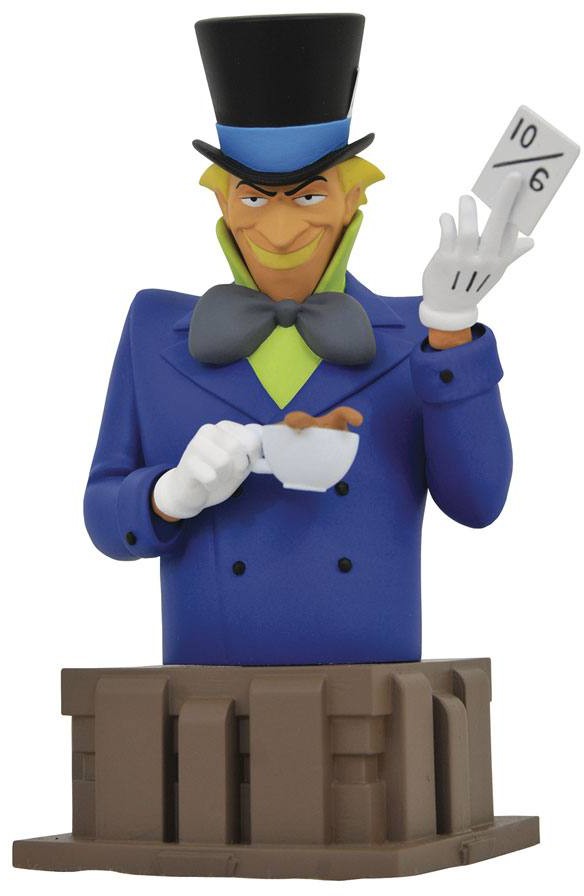 He's mad as a hatter! Jervis Tetch, a.k.a. the Mad Hatter, is the next Batman villain to join the resin bust line based on Batman: The Animated Series! Holding a cup of tea and one of his trademark mind-control cards, the Hatter measures approximately 6-7 inches tall and comes on a decorative pedestal inspired by the architecture of Gotham city. Designed by Barry Bradfield, sculpted by Varner Studios!