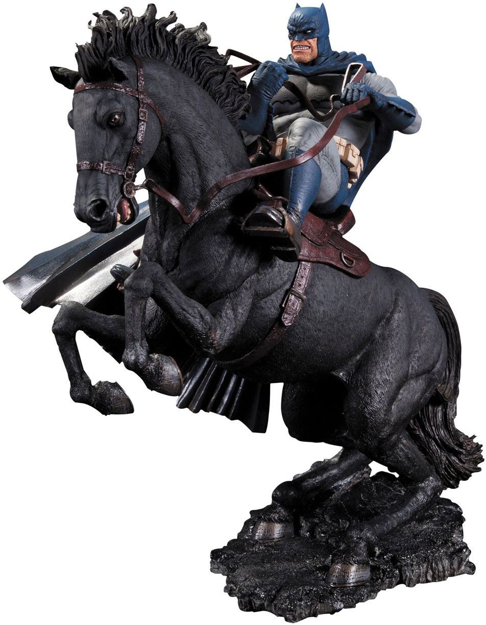A Ride to Remember! Mounted on a horse as black as the night he defends, the Caped Crusader rallies the troops in this new statue inspired by Frank Miller's legendary work, Batman: The Dark Knight Returns.