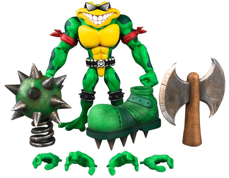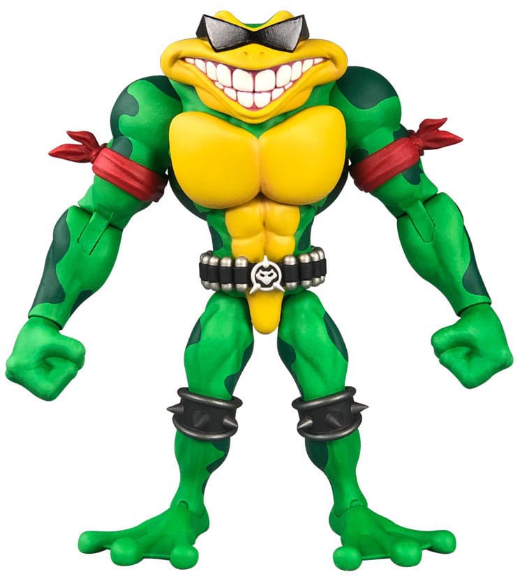 Rash is the most outgoing and coolest of the Battletoads. Don't believe it? Just ask him! Rash stands just under 6" tall and features 30 points of articulation for ultimate posing. Removable armbands and utility belt allow you to choose your favorite look for Rash. Other accessories include: removable sunglasses, 3 sets of hands, and 3 interchangeable kicking attachments--a giant spiked mace, giant boot with spiked sole, and giant axe!