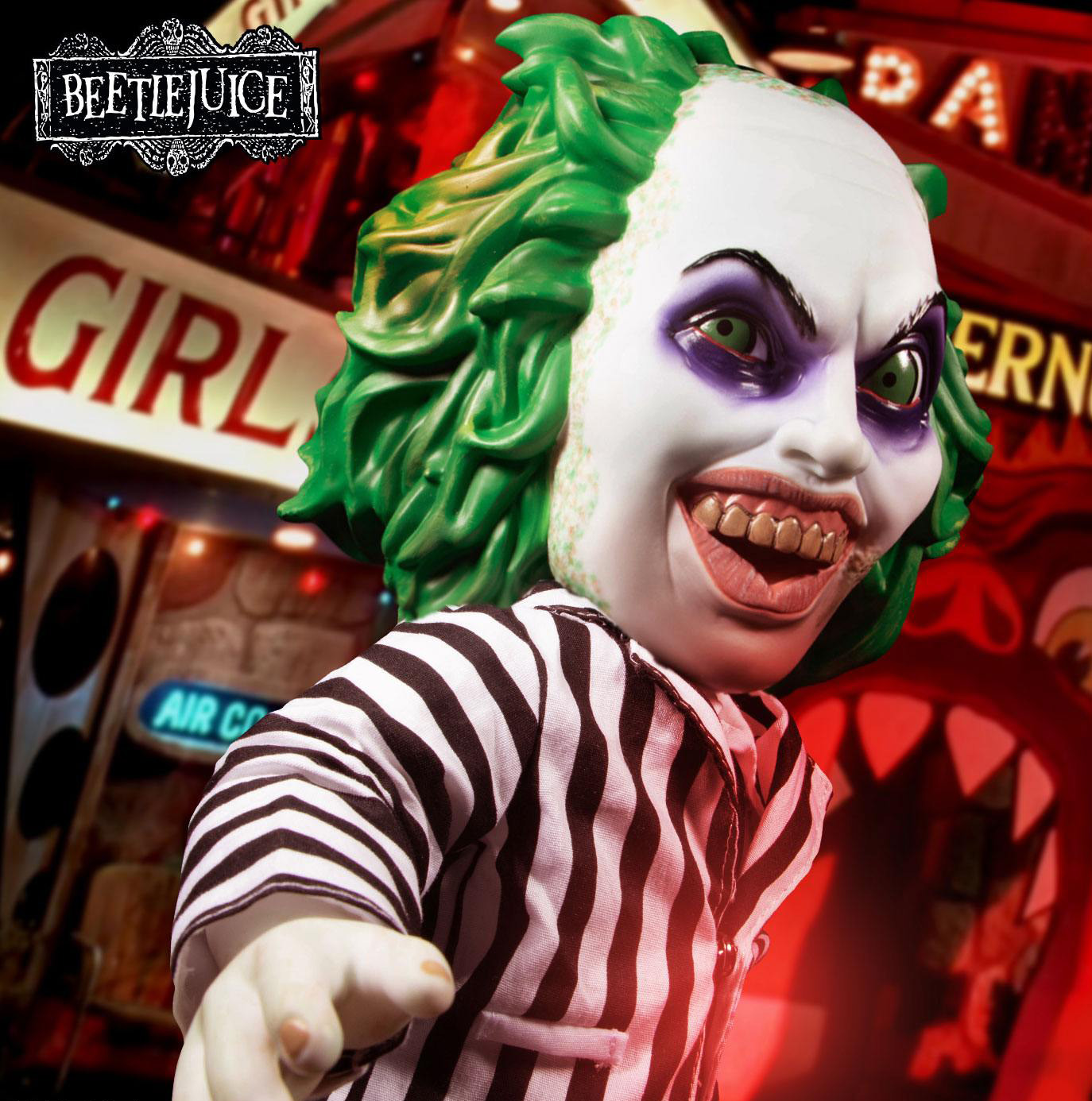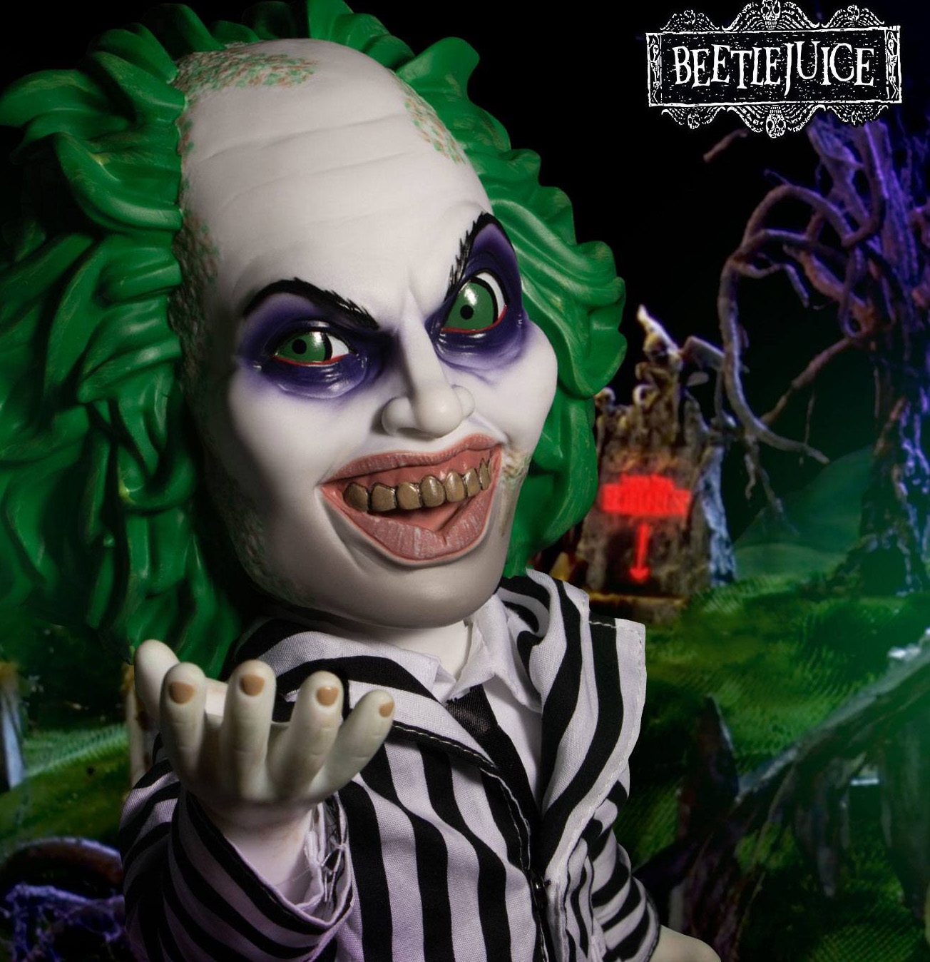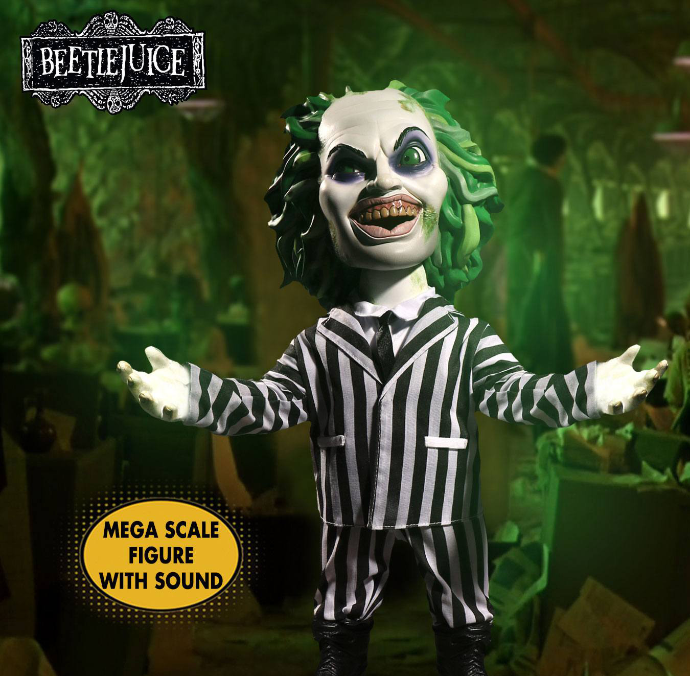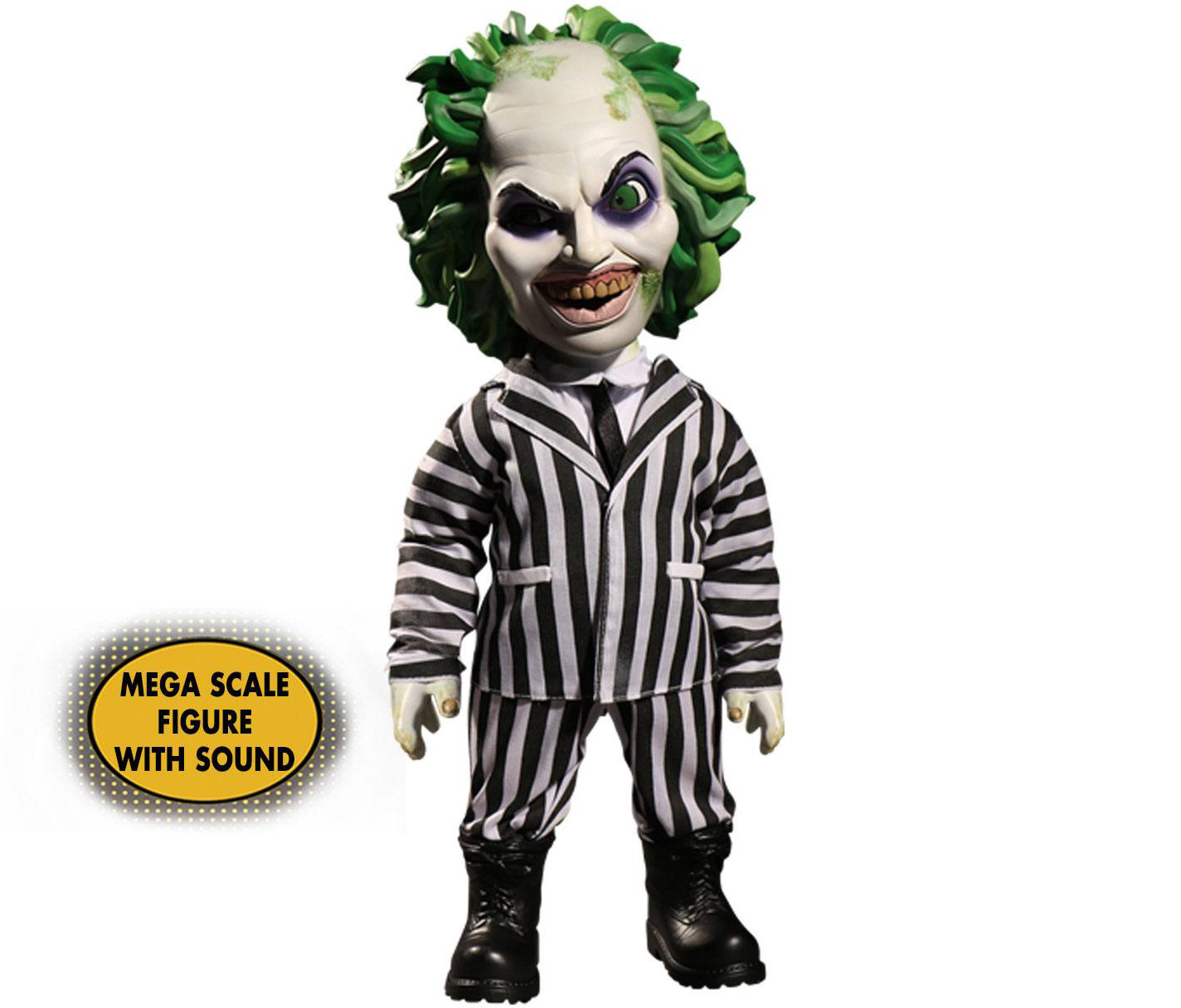 The MDS Mega Scale Talking Beetlejuice is dressed to kill in his iconic striped suit and sandworm stompin' boots. He parades his unkempt, grisly green hair and flashes a yellow-toothed smile.