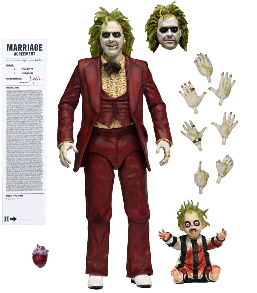 Denna fullt artikulerade actionfigur innehåller utbytbara ansiktsplattor och händer, hjärta, blodiga Baby Beetlejuice och äktenskapskontraktet undertecknat av Lydia. Levereras i en fönsterförpackning med öppningsbar frontflik, perfekt för din skräcksamling.