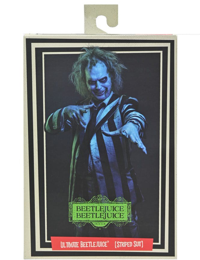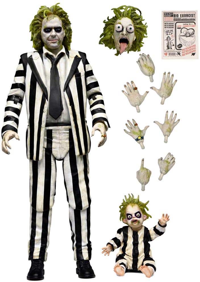 Dressed in his classic black-and-white striped suit, this NECA Ultimate Beetlejuice figure stands in 7-inch scale and includes interchangeable heads and hands, Betelgeuse flier, and the adorable Baby Beetlejuice! Comes in collector-friendly window box packaging with opening front flap.