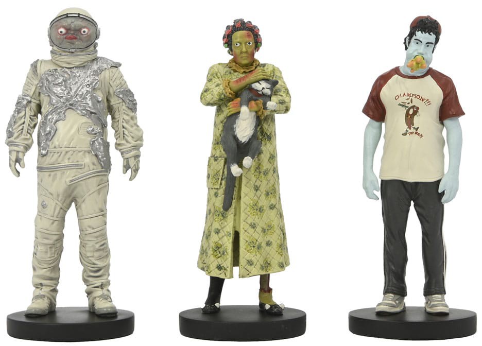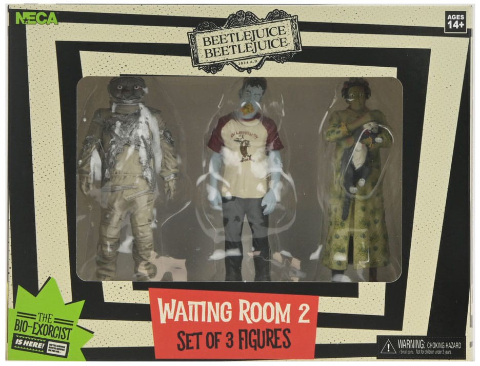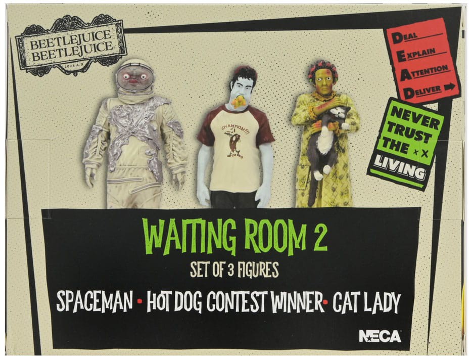 Never trust the living. The Ghost with the Most is back in the 2024 Tim Burton film Beetlejuice Beetlejuice! Recreate the Afterlife's iconic waiting room with this highly detailed 3-piece figure set from NECA. Figures include the characters Spaceman, Hot Dog Contest Winner, and Cat Lady. Each one measures about 4 inches tall, including the base, and is ready to take your Beetlejuice display to the next level! Comes in collector-friendly window box packaging.