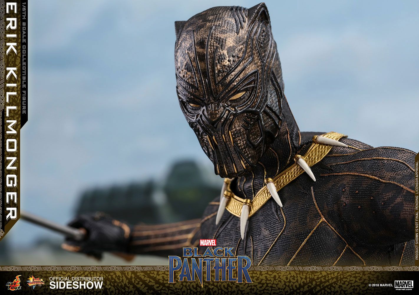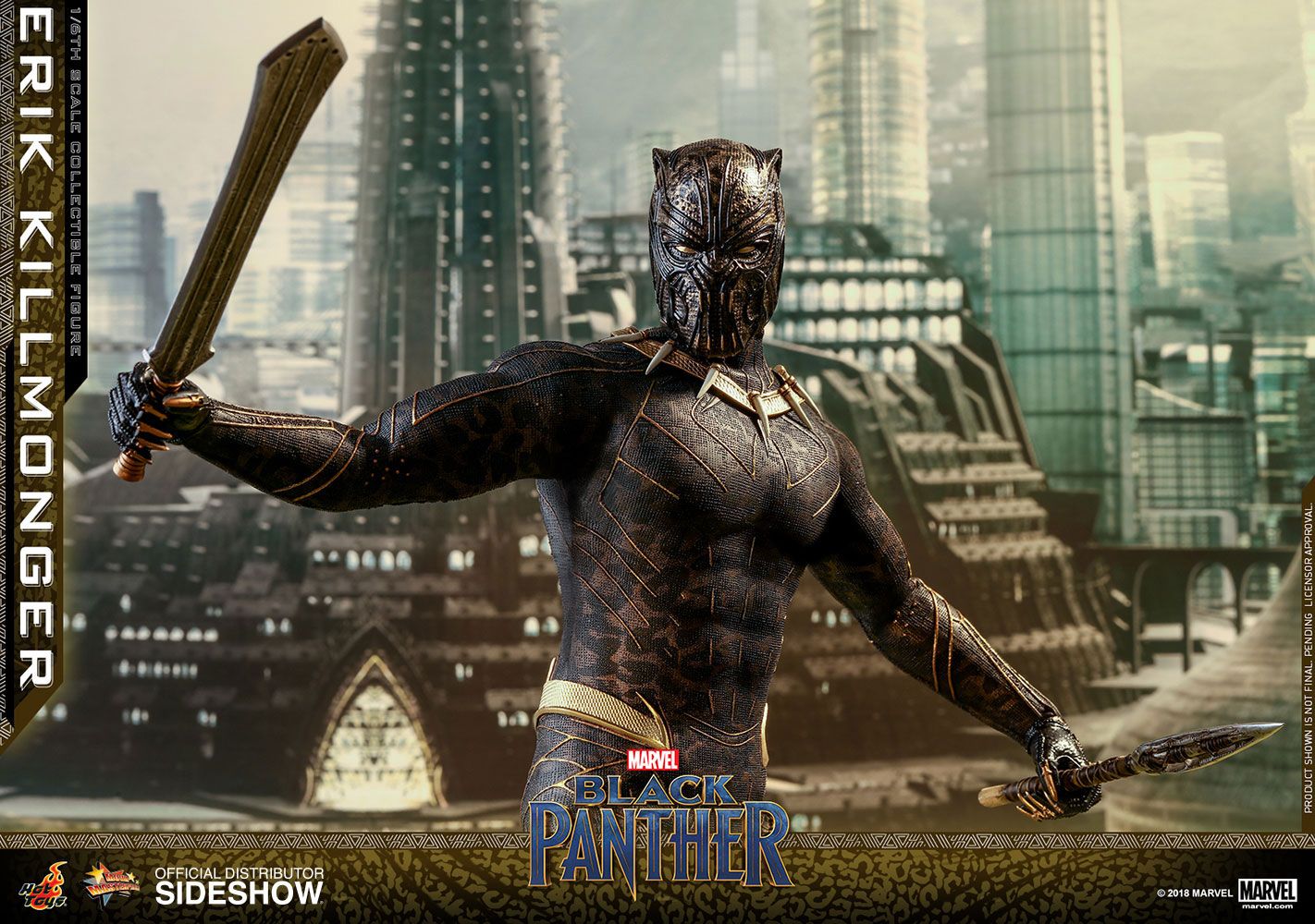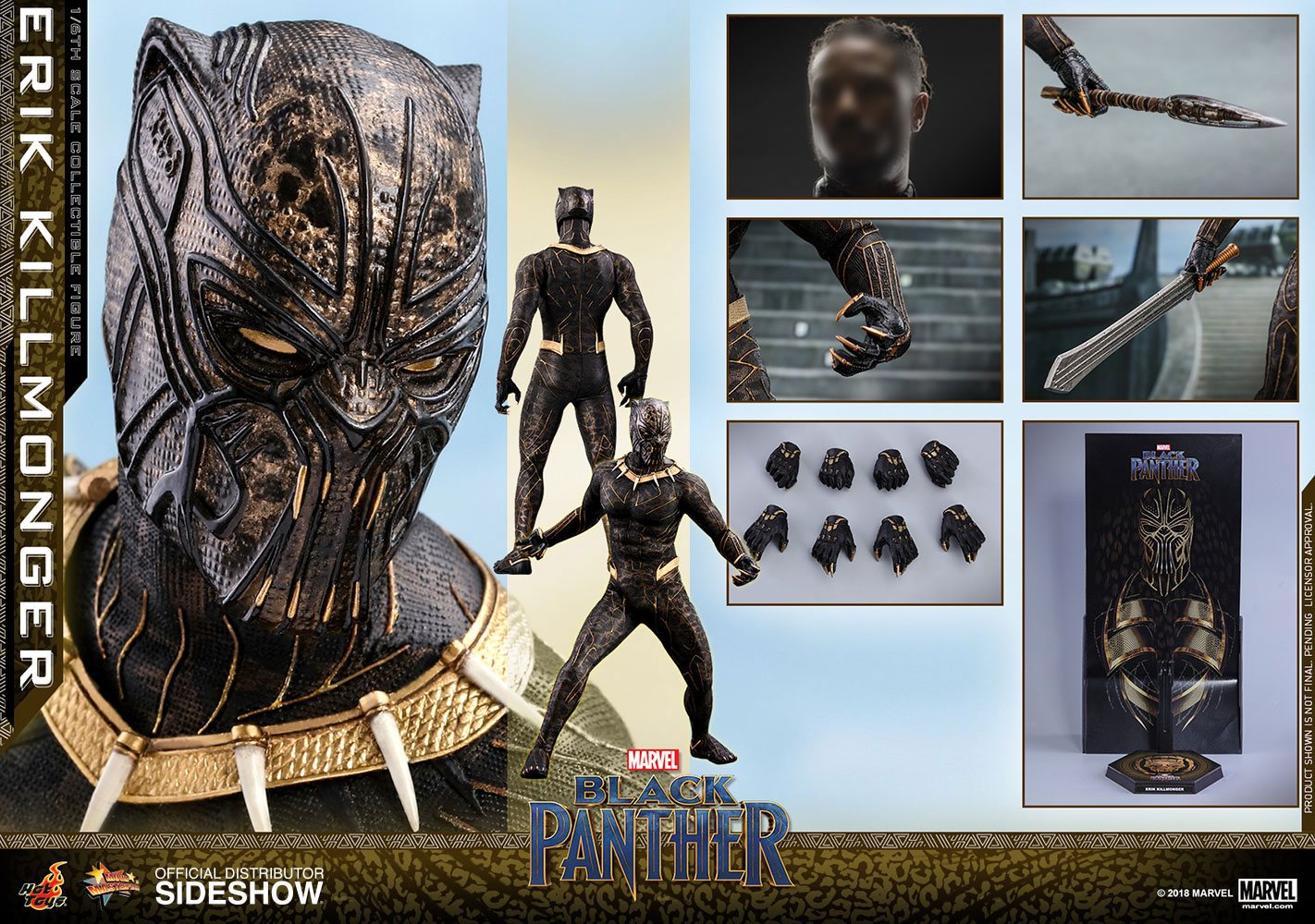The screen–accurate collectible figure is specially crafted based on the appearance of Michael B. Jordan as Erik Killmonger in the film featuring two interchangeable heads which include a newly sculpted unmasked head sculpt with authentic likeness and all-new masked head with fangs and highly detailed textures, a newly developed muscular body, skillfully tailored Golden Jaguar suit with remarkable tailoring and golden accents, detail recreation of Erik Killmonger’s weapons, and a specially designed movie-themed figure stand!