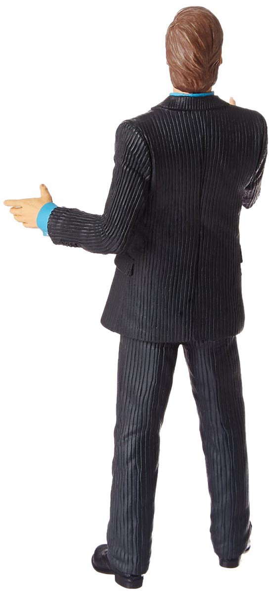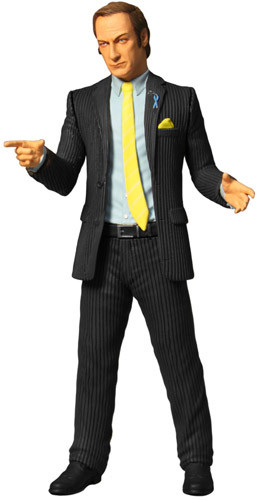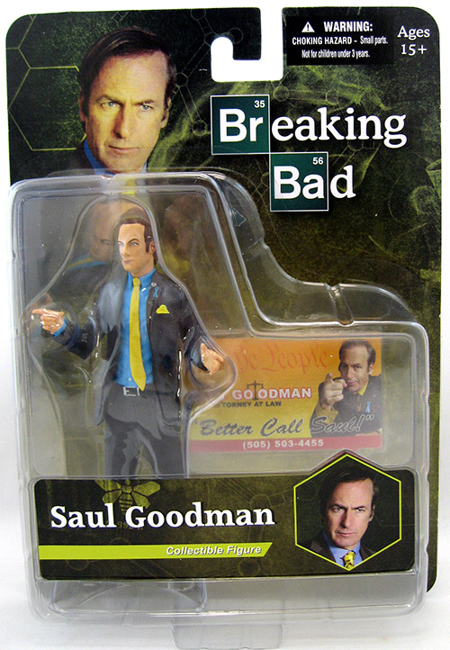 His pinstriped business suit is complimented by his token wireless headset and light blue Wayfarer 515 awareness ribbon. Saul Goodman comes complete with his business card in a display friendly blister card package.