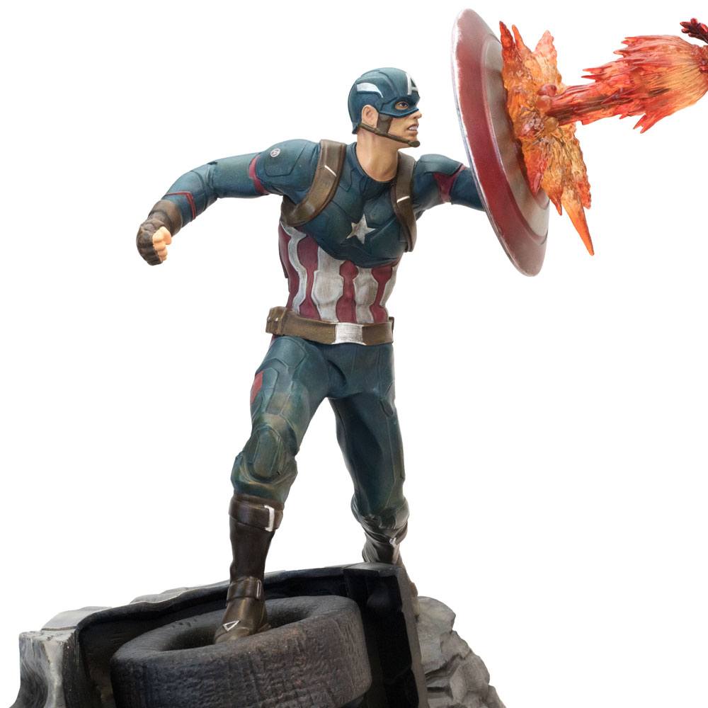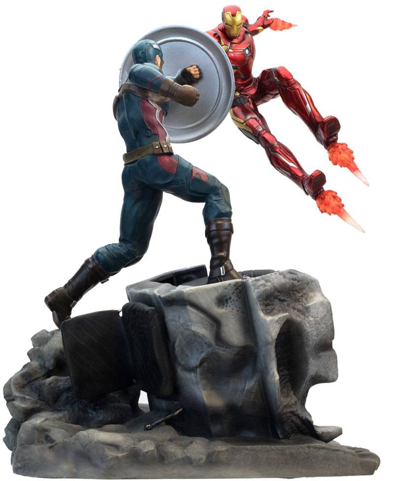 Capturing Captain America bracing for impact as Iron Man floats in midair blasting at his former friend, this hand-paitned piece is stands 43 cm tall and is crafted in heavyweight polystone and PVC to accent the transparent flame effect.