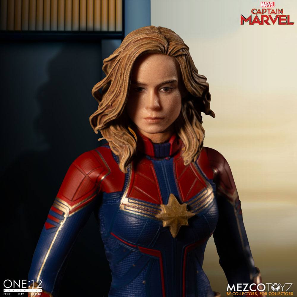 The One:12 Collective Captain Marvel-figuren har 3 huvudporträtt med Brie Larsons likhet. Ett maskerat huvud har ögon som lyser i mörkret och framhäver hennes superkrafter. Captain Marvel följs av hennes reskamrat och husdjurskatt, Goose.