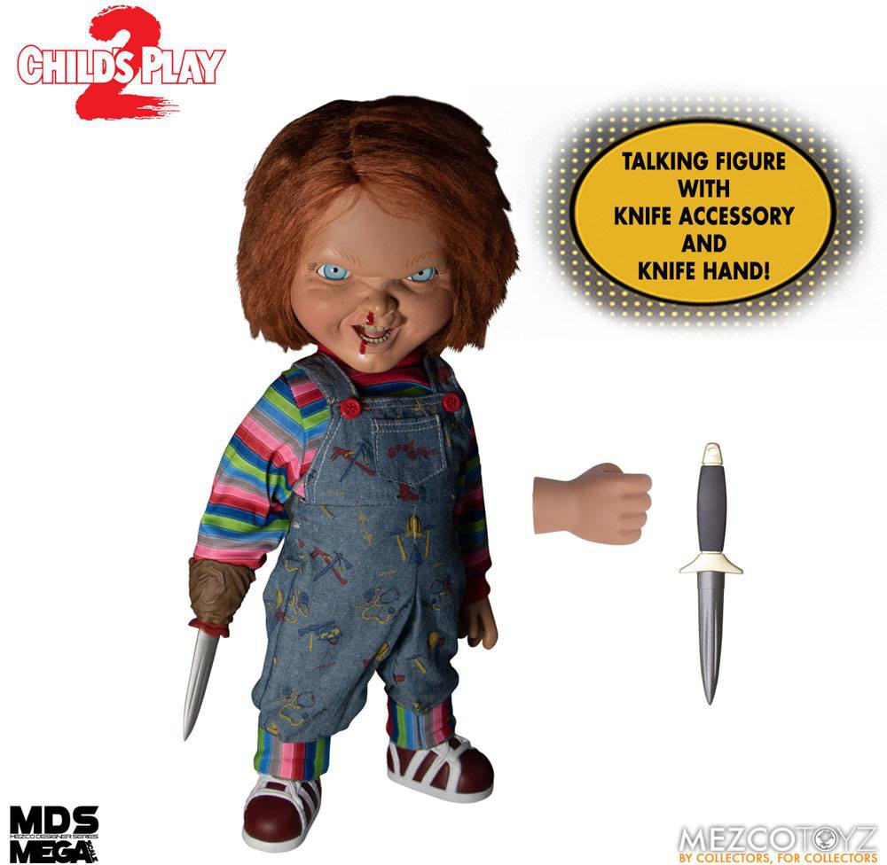 The MDS Mega Scale Talking Menacing Chucky stands 15" tall and comes packaged in a collector-friendly, film-inspired window box.