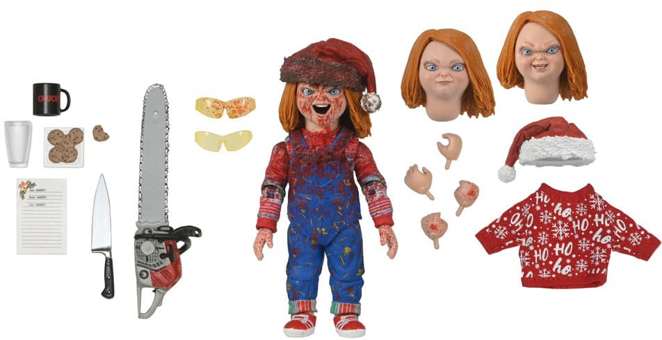 Add some ho-ho-horror to your collection with NECA! This Ultimate Chucky action figure features everyone's favorite murderous doll decked out for the holidays, as seen on the hit "coming of rage" TV series, Chucky! When a vintage Chucky doll turns up at a suburban yard sale, an idyllic American town is thrown into chaos as a series of horrifying murders begins to expose the town's hypocrisies and secrets. Dressed in a soft goods holiday sweater, this festive figure comes with a killer lineup of accessories: interchangeable heads and hands, bloody and clean Santa hats, bloody and clean safety goggles, Santa's list, milk and cookies, Chucky mug, chainsaw, and kitchen knife. This figure stands 4 inches tall with over 15 points of articulation. Comes in collector-friendly deluxe window box packaging with opening flap.