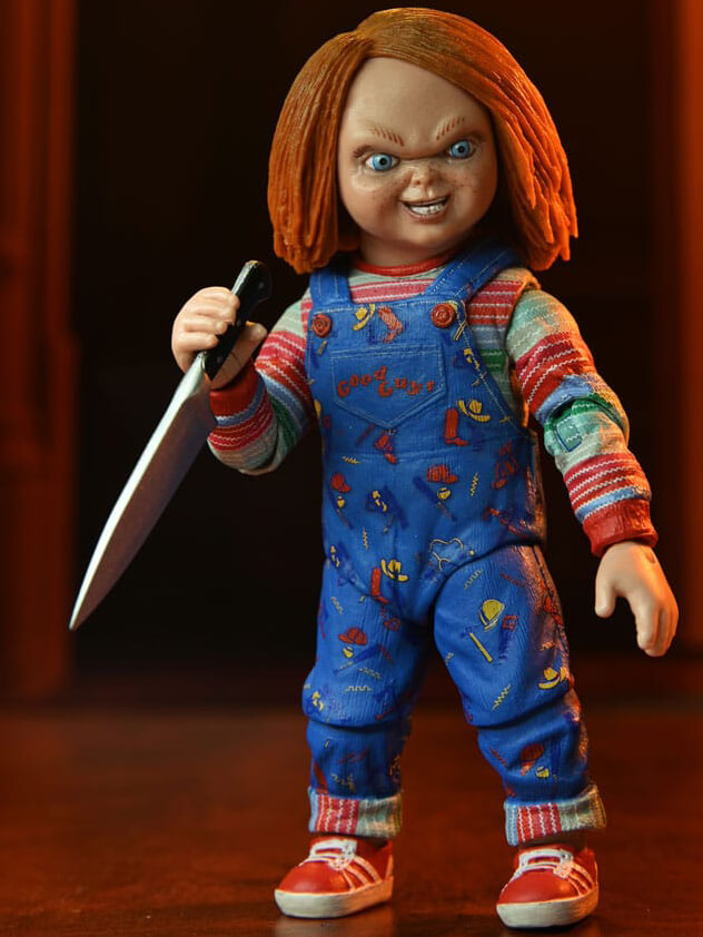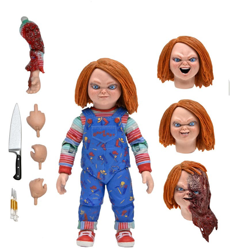 Chucky is back! When a vintage Chucky doll turns up at a suburban yard sale, an idyllic American town is thrown into chaos as a series of horrifying murders begins to expose the town's hypocrisies and secrets. This Ultimate action figure depicts the murderous doll, inhabited by the soul of a serial killer, as seen in the all-new "coming of rage" TV series, CHUCKY. Including four interchangeable head sculpts, interchangeable hands, butcher knife, syringe bundle, and an interchangeable burnt arm. This figure stands 4" tall with over 15 points of articulation. Comes in collector-friendly deluxe window box packaging with opening flap.