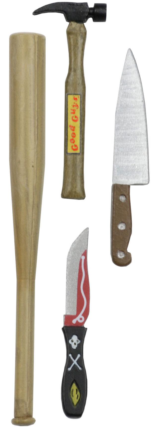 Chucky features rooted hair, and comes with baseball bat, voodoo knife, regular knife and Good Guys hammer accessories.