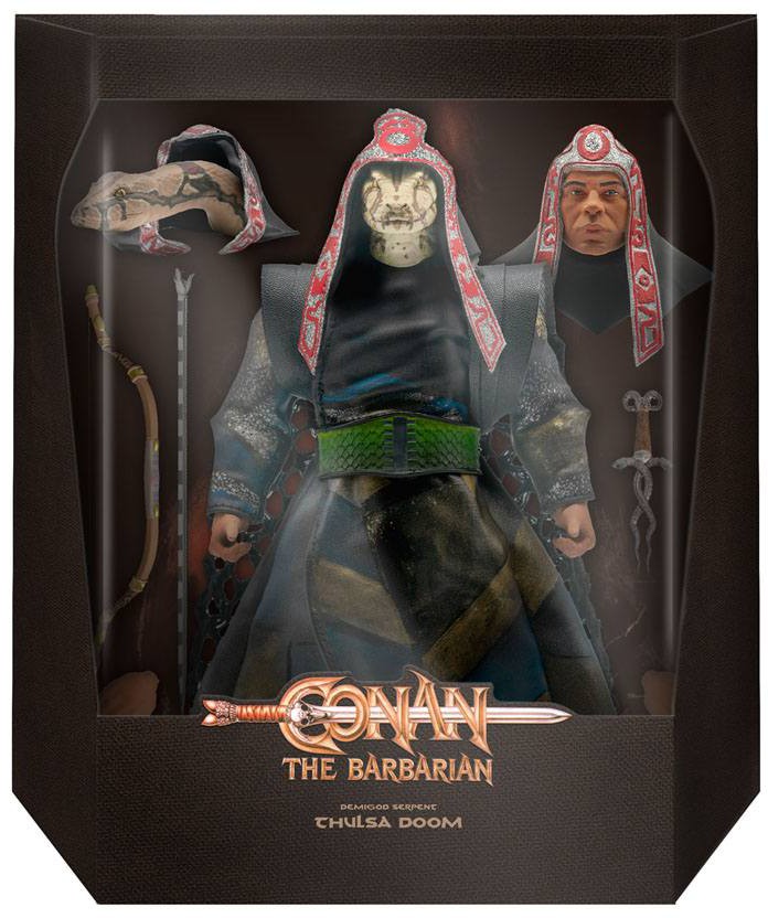 Att bara nämna den kraftfulla trollkarlen Thulsa Doom får dödliga män att skaka i rädsla, men när han förvandlas till the Snake Priest är det inte konstigt att han är en match för även den mäktiga Conan. Denna Thulsa Doom ULTIMATES! Figur som är baserad på transformationsscenen i Conan the Barbarian, kommer med både ett ormhuvud och ett mänskligt huvud med ormögon, en full mantelrock, hans båge och ormpil, plus en fristående orm. Denna 7 "högartikulerade actionfigur kommer i begränsad upplaga.