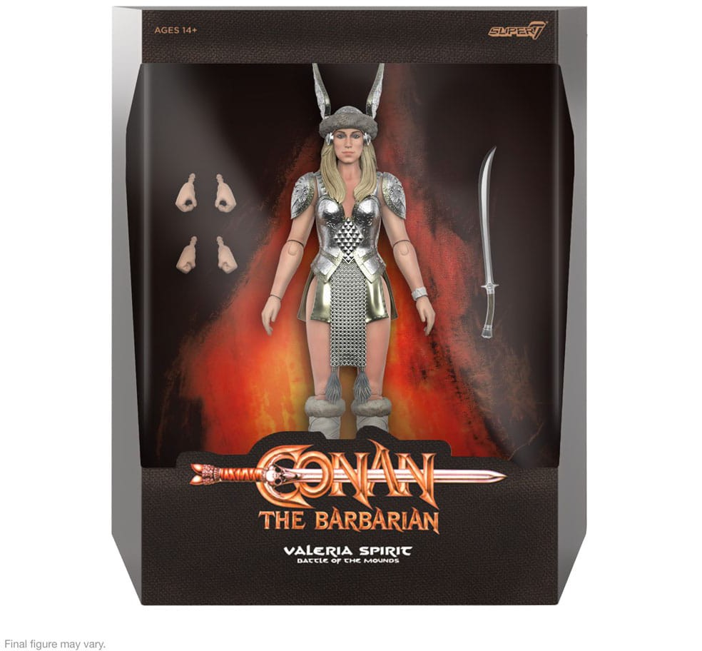 Den här mycket artikulerade Conan the Barbarian ULTIMATES! figuren av Battle of the Mounds Valeria Spirit visar Conans älskade följeslagare och stridskamrat i sin Valkyria-liknande andeform och kommer med flera utbytbara händer samt ett Valkyria-svärd som tillbehör.