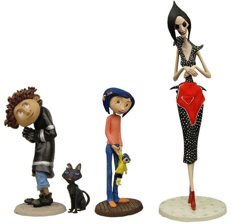 Denna uppsättning med 4 PVC-figurer inkluderar Coraline, hennes vårdnadskatt, Wybie och Other Mother. Var och en är mellan 3 och 14 cm lång.