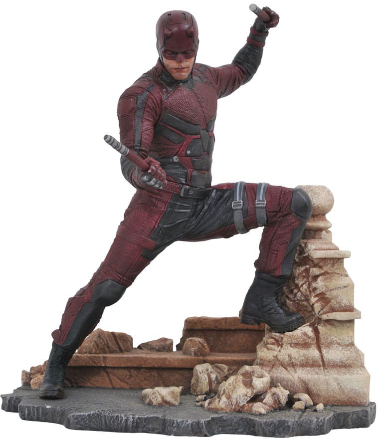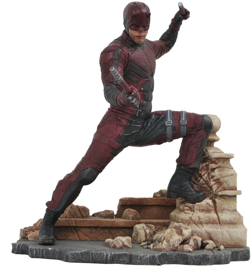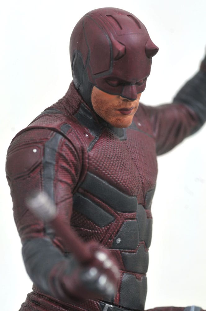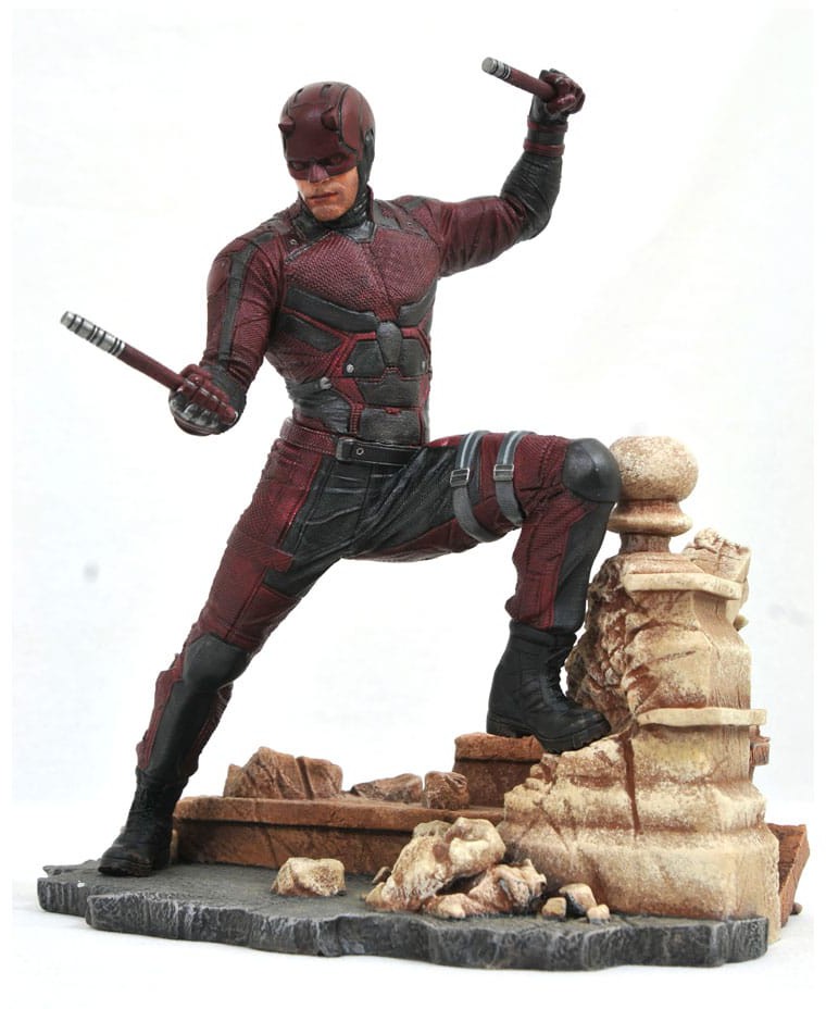 Tillsammans med Luke Cage och Punisher avbildar denna ca 28 cm stora skulptur TV-versionen av den behornade hjälten från Hell's Kitchen i fantastisk detalj. Detta diorama fångar skådespelaren Charlie Cox likhet och kostym och ser Matt Murdock stå på en takpiedestal med sina billy clubs redo. Daredevil är i samma skala som alla Gallery och Femme Fatales PVC-dioramor, och levereras i en fönsterlåda i fullfärg. Skulpterad av Rocco Tartamella!
