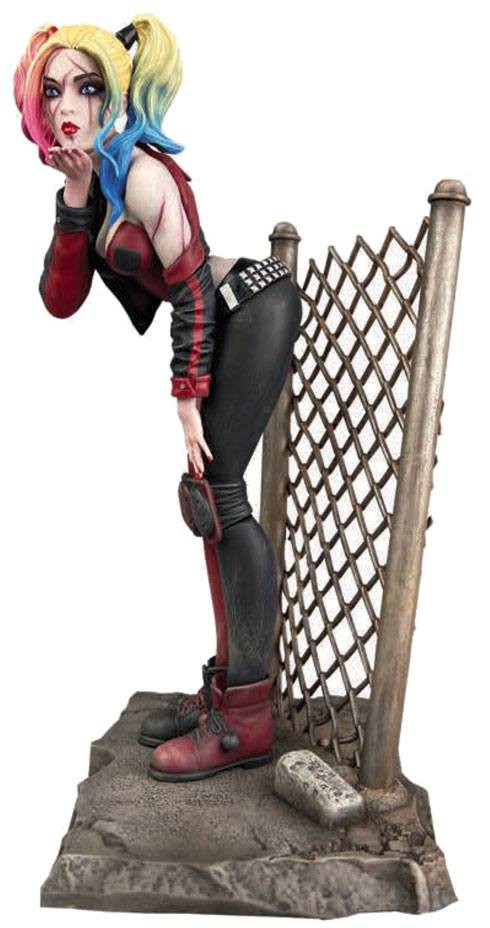 Death becomes her! The Suicide Squad's liveliest heroine has survived the zombie outbreak and retained her trademark attitude. Blowing a kiss with her face covered with scars, she strikes a pose by a chain-link fence in this approximately 8" sculpture. Cast in high-quality PVC, it features detailed sculpting and paint applications and comes packaged in a full-color window box. Sculpted by Sam Greenwell.