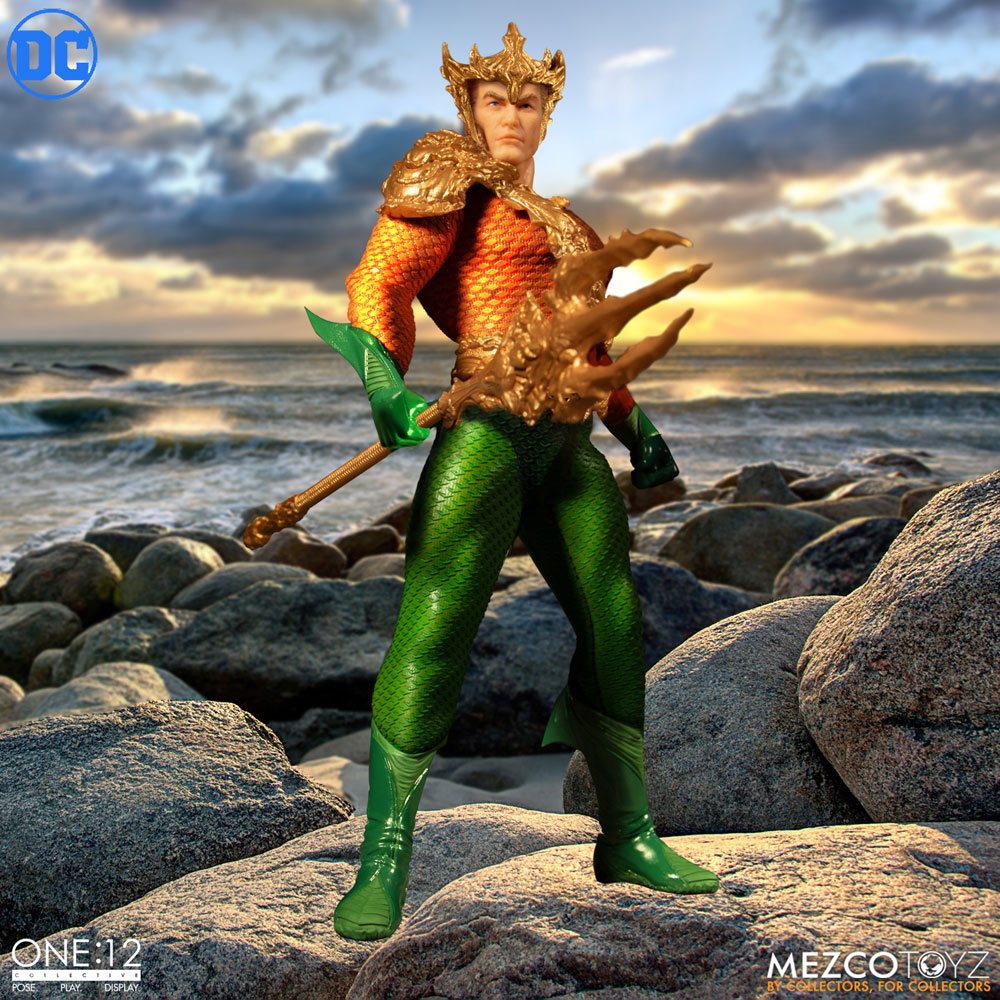 Denna One:12 Collective Aquaman är utrustad i en fjällig, mjuk rustning och en Atlantisk våtdräkt, inspirerad av hans klassiska utseende i serietidningarna.