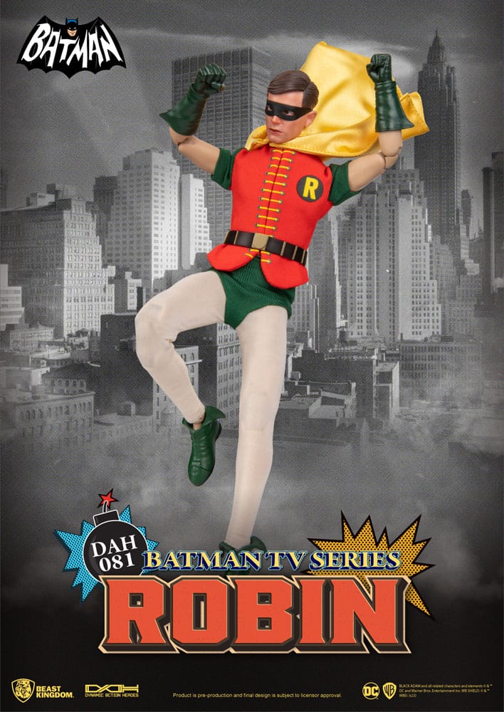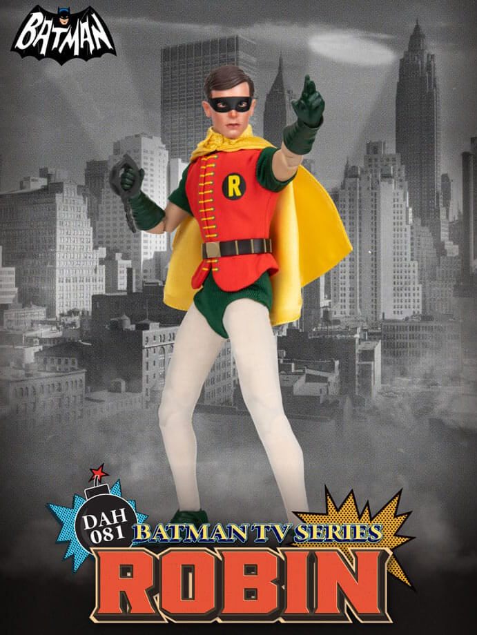 The "DAH-081 Batman TV Series Robin" figure boasts approximately 18 points of articulation, making it highly poseable. It comes complete with a classic TV drama green and orange costume made of real fabric and a golden cape. The super realistic Robin head sculpture and the inclusion of classic series props, such as handcuffs, Robin's walkie-talkie, and up to five different interchangeable hand shapes, further enhance the figure's playability. Collect both "Batman" and "Robin" figures to create your own "Batman TV Series" mini theater!