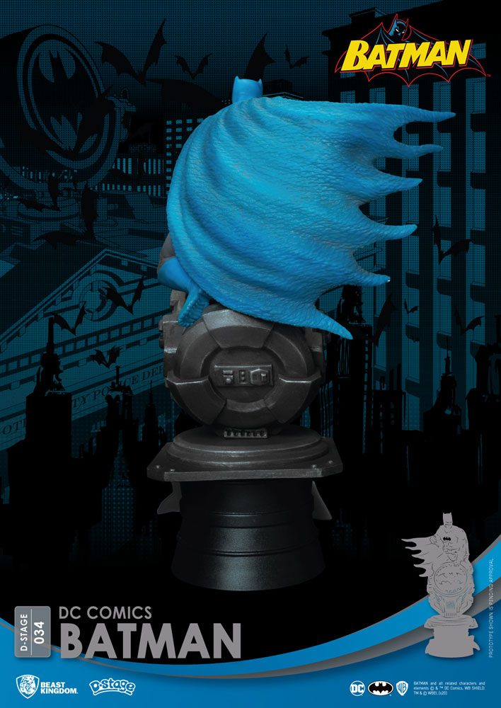 The D-Stage Batman on the other hand is every bit the personification of heroism and strength. Standing on top of the Bat-Signal searchlight, Batman is looking determined to solve his latest crime, and is dressed in the classic blue and grey colors with the yellow and black bat logo made popular in the original comics.