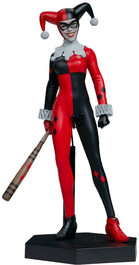 Inspirerad av hennes utseende i de klassiska serietidningarna har Harley Quinn Sixth Scale Figure en tygdräkt med svarta och röda paneler i diamantmönster och skulpterade vita accenter, som hennes krage och handleder. Harleys flinande porträtt har hennes typiska bleka hudfärg under en svart ögonmask och hennes tvåtonade jucklarhuva kompletterar hennes galna uttryck.