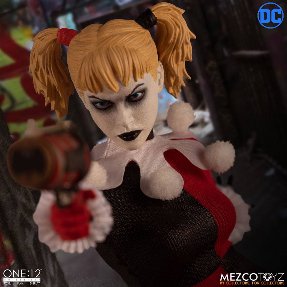 One:12 Collective Harley Quinn bär en passande hycklardräkt med volangdetaljer runt handlederna och en pom-pom runt halsen. Figuren levereras komplett med tre huvudporträtt, som visar hennes lockande men ändå helt galna ansikte. Harley är väl utrustad för att orsaka kaos på Gothams gator med en överdimensionerad klubba, en granat, en bomb, en pop-gun med bifogad kork, ett raketgevär med en raket samt en Joker-docka.
