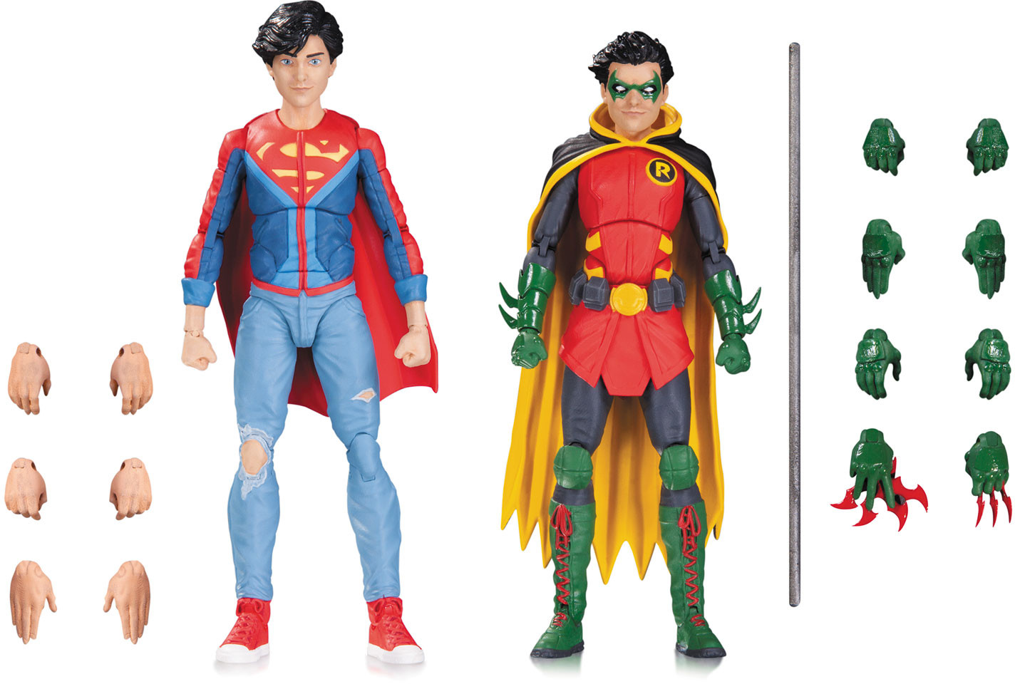 DC's newest heroic duo, Robin and Superboy, team up in this new action figure 2-pack. Each figure comes with spare hands. Robin comes with a bo staff, and Superboy comes with a hover base.