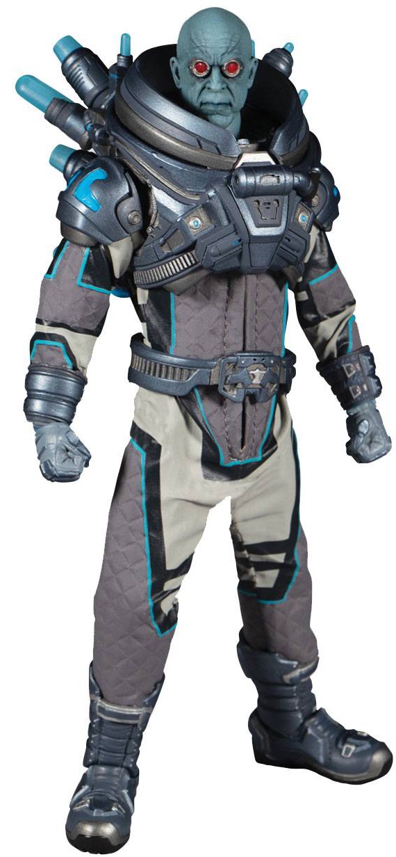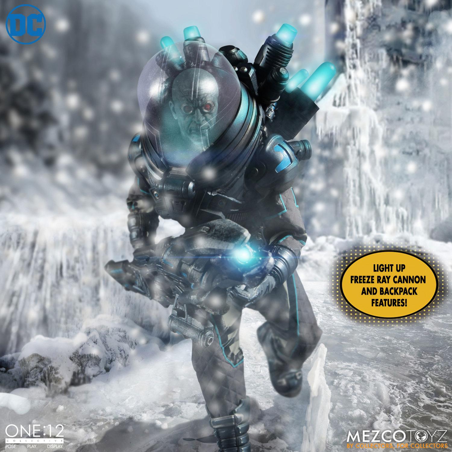 Equipped with weaponry capable of causing more than just frostbite, Mr. Freeze comes complete with a freeze ray cannon with light-up function, freeze ray handgun, an ice blast FX that fits over the chests of other One:12 figures, and a freeze FX that fits over the heads of other One:12 figures.