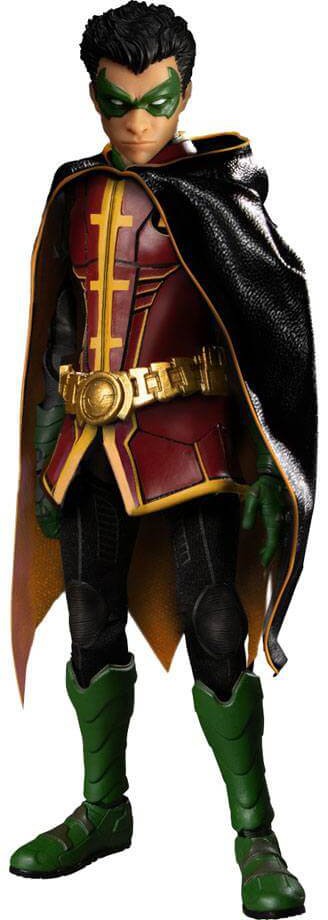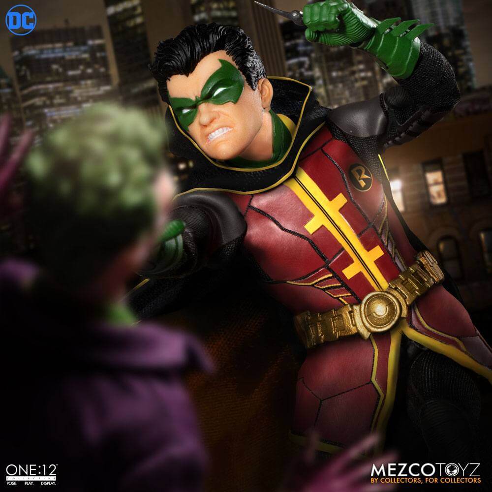 The One:12 Collective Robin wears an armored tunic with 'R' insignia over his fitted bodysuit, utility belt, and hooded, serrated cape with an integrated posing wire. The Boy Wonder comes with 3 head portraits with various expressions.
