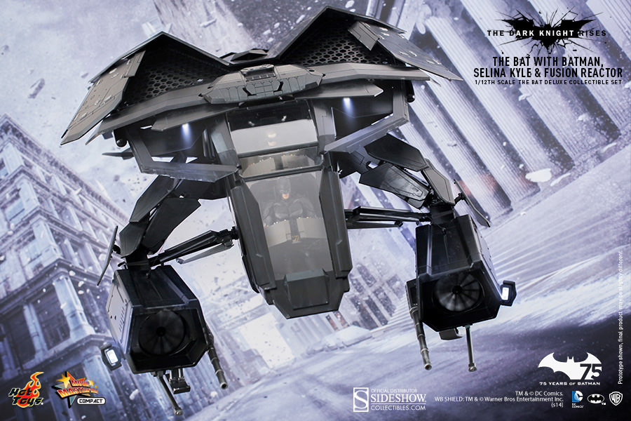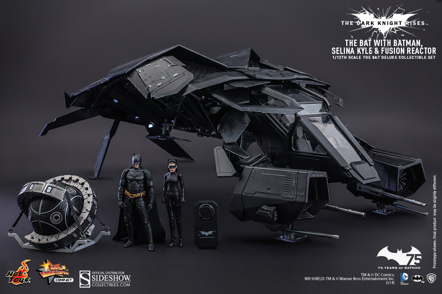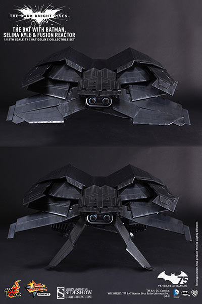 To celebrate Batman's 75th anniversary, Sideshow Collectibles and Hot Toys are proud to introduce the 1/12th scale The Bat Deluxe Collectible Set. As part of Hot Toys' new MMS Compact Series, The Bat Deluxe is highly detailed and specially crafted based on the film,The Dark Knight Rises.In addition to featuring a finely sculpted aircraft, remote controlled LED lights, spinning propeller functions, and 1/12th scale Batman Collectible Figure, this Deluxe Set will also include a 1/12th scale Selina Kyle Collectible Figure and the fusion reactor that Talia al Ghul planned to use to destroy Gotham. Batman fans don't miss your chance to catch this remarkable collectible set!