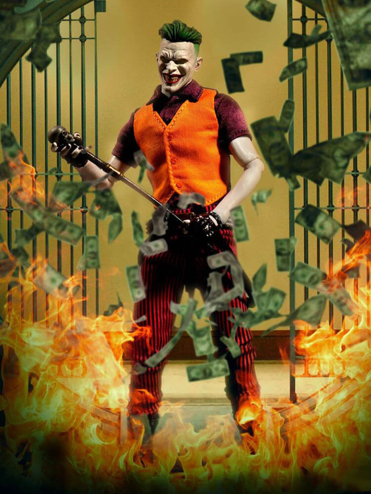 The Clown Prince of Crime presenteras i en kortärmad skjorta med knappar, skräddarsydd väst och pinstripe-byxor. Han är utrustad med de mest djävulska tillbehören, inklusive en nallebjörn som är fastspänd till dynamit! Figuren kommer med två huvudporträtt som fångar hans galna ansikte perfekt.